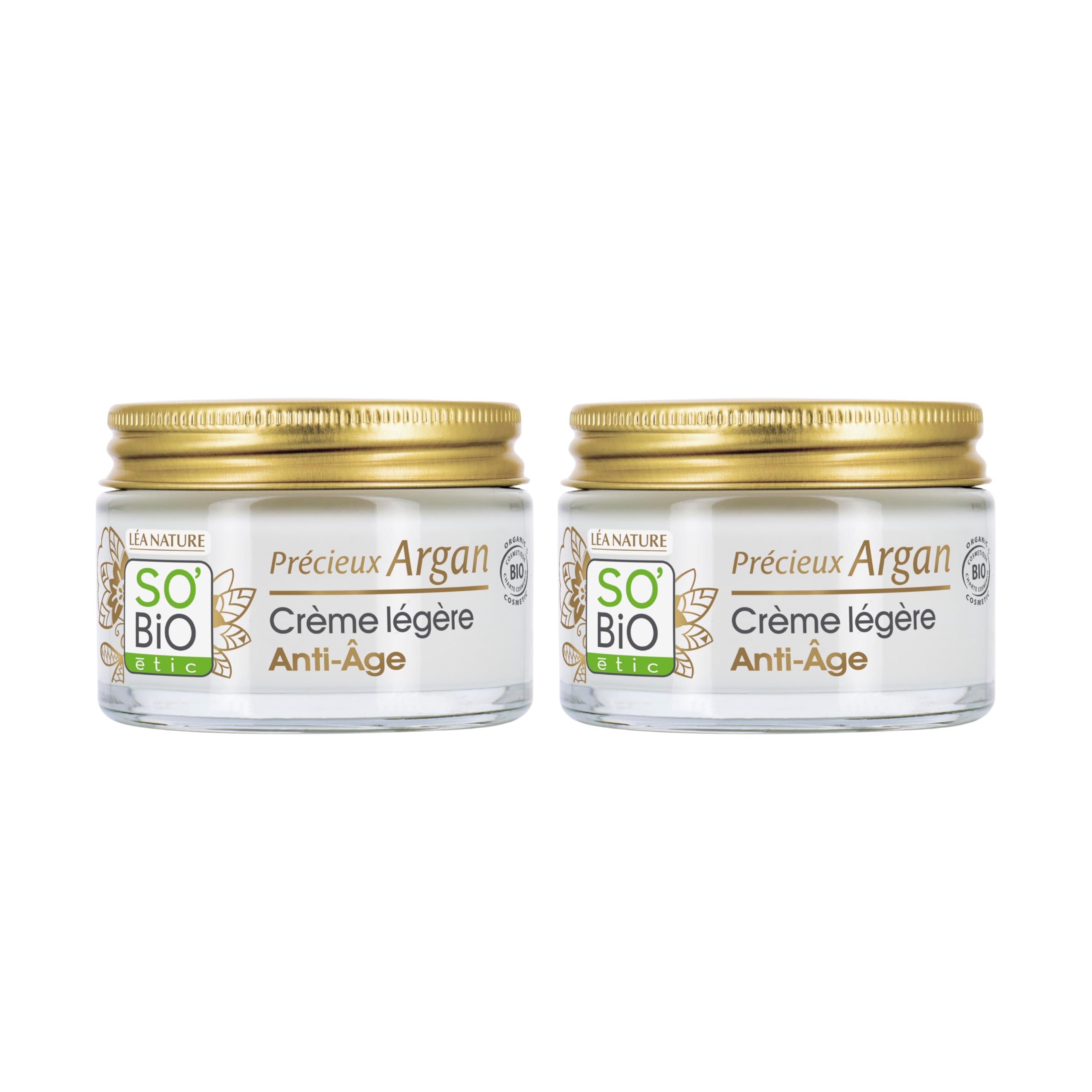 LÉA NATURE SO BiO étic Crème légère Anti-Âge jour – Précieux Argan Lisse et Raffermit la peau Huile d'Argan Bio Acide Hyaluronique 99 d'origine naturelle Made in France Lot de 2x50 ml