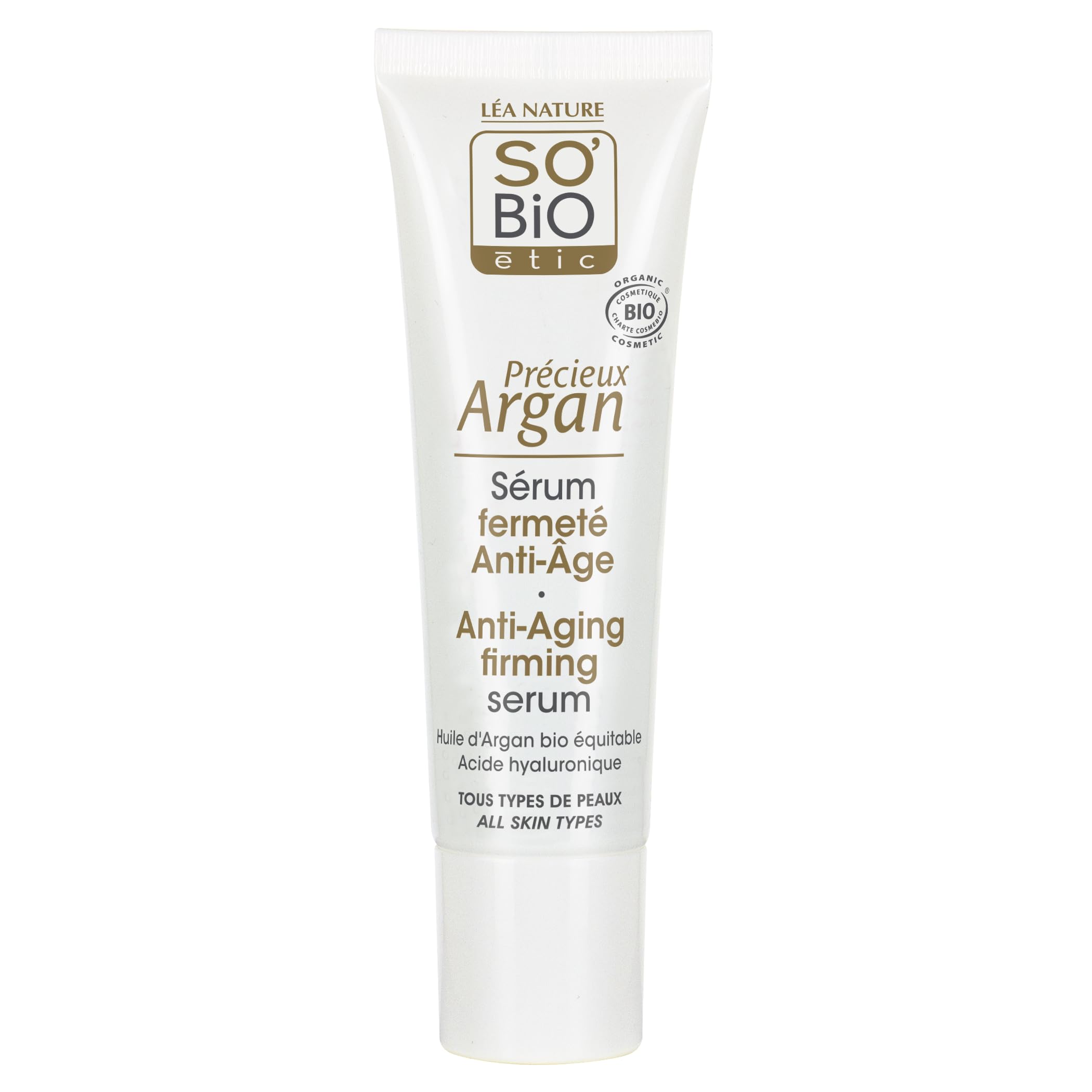 So 'bio étic précieux Argan anti-aging firming serum is rich in Argan oil, This serum firms the skin and gives an instant tensor effect. As a youth Enhancer, the hyaluronic acids increase skin's firmness. At the same time, it provides nutrition and protection. Suitable for all skin types. So 'bio étic created précieux Argan, an anti-aging line of skincare that offers an exclusive Synergy of active ingredients: Organic Argan oil and natural hyaluronic acid. This duet of active ingredients helps fight the signs of aging. So 'bio étic has selected organic Argan oil from its original area of production, between essaouira and Agadir and is partnering with Terre et human is me in order to promote and facilitate ecological farming. So 'bio étic has demonstrated its strong long-term commitment to this sector; that's because we do not consider Argan oil merely as a trendy fashion, we know it has a wealth of benefits to offer the world of cosmetics. So 'bio étic skin care products Offer all of the goodness of nature while pleasuring the senses. The natural and delicate fragrances and sensory textures of our cosmetics turn each and every beauty routine into a privileged moment. Supporter of the "1% for the planet club": 1% of the total sales of its organic brands to funding environmental conservation projects. INGREDIENTS Key Ingredients Formulated with: Organic argan oil, Hyaluronic acid. Ingredients: Aqua (Water), Anthemis Nobilis Flower Water*, Glycerin, Coco-Caprylate, Cocoglycerides, Glyceryl Stearate Citrate, Polyglyceryl-3 Stearate, Microcrystalline Cellulose, Benzyl Alcohol, Argania Spinosa Kernel Oil*, Hexyldecanol, Hexyldecyl Laurate, Hydrogenated Lecithin, Ribose, Jojoba Esters, Parfum (Fragrance), Xanthan Gum, Cellulose Gum, Avena Sativa (Oat) Kernel Extract*, Dehydroxanthan Gum, Linum Usitatissimum (Linseed) Seed Extract, Linalool, Limonene, Sodium Levulinate, Sodium Hyaluronate, Sodium Phytate, Sodium Benzoate, Tocopherol, Benzyl Salicylate, Glyceryl Caprylate, P-Anisic Acid, Helianthus Annuus (Sunflower) Seed Oil, Lactic Acid, Sodium Hydroxide, Anise Alcohol, Amyl Cinnamal, Geraniol, Alcohol. *Ingredients from organic farming.Free from paraben, silicon and synthetic Fragrance. Suitable for all skin types. Provides nutrition and protection. Hyaluronic acids increase skin's firmness. Rich in Argan oil.