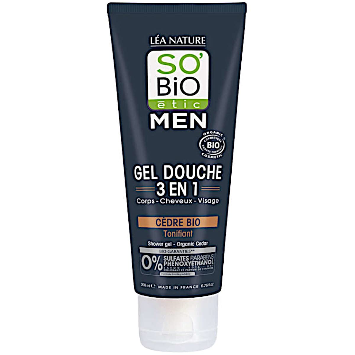 The commitment to organic and natural cosmetics since 1996, which respects nature, people, and all living things, isn't something that can be decreed… It has to be proven! And for over ten years, SO'BiO étic has demonstrated this every day. A total commitment, from A to Z, from product formulation to shelf placement, in a comprehensive and coherent organic approach. INGREDIENTS Aqua water eau, glycerin, decyl glucoside, sodium cocoyl glutamate, lauryl glucoside, cocamidopropyl betaine, benzyl alcohol, xanthan gum, lactic acid, sodium chloride, parfum (fragrance), guar hydroxypropyltrimonium chloride, aloe barbadensis leaf juice powder , pogostemon cablin (leaf) oil, pogostemon cablin oil, limonene, cedrus atlantica bark oil , linalool, sodium hydroxide.Certified organic - Made in France. Sulfate-free. 3-in-1 formula: Cleanses face, body, and hair. Its invigorating woody fragrance instantly awakens your body. So'Bio étic invigorating shower gel for men with organic cedar.So'Bio Étic Gel douche Men 3 en 1, Cèdre bio 200 mlDESCRIPTION DU PRODUIT DESCRIPTION DU PRODUIT L'engagement en faveur d'une cosmétique bio et naturelle dès 1996 qui respecte la nature, l'Homme et le vivant, ne se décrète pas… Il se prouve ! Et depuis plus de dix ans, SO'BiO étic le démontre tous les jours. Un engagement total, de A à Z, de la formulation des produits jusqu'à leur mise en rayon, dans une démarche globale bio-cohérente. INGRÉDIENTS Aqua water eau, glycerin, decyl glucoside, sodium cocoyl glutamate, lauryl glucoside, cocamidopropyl betaine, benzyl alcohol, xanthan gum, lactic acid, sodium chloride, parfum (fragrance), guar hydroxypropyltrimonium chloride, aloe barbadensis leaf juice powder , pogostemon cablin (leaf) oil, pogostemon cablin oil, limonene, cedrus atlantica bark oil , linalool, sodium hydroxide.Certifié biologique - Fabriqué en France. Sans sulfate. Formule 3 en 1 : Nettoie Visage, Corps et cheveux. Son parfum aux accords boisés vivifiants réveille votre corps en un instant. Gel douche tonifiant pour hommes So'Bio étic au Cèdre biologique.