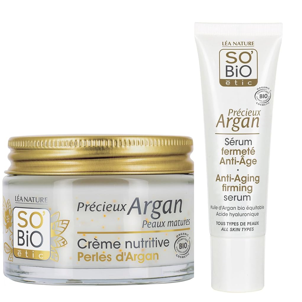 Treat your skin to a complete anti-aging routine with the Precious Argan Duo from SO'BiO étic. The Nourishing Cream for Mature Skin, enriched with argan pearls, organic camellia oil, and plant-based collagen, intensely nourishes, redensifies, and firms the skin for optimal comfort. The Anti-Aging Firming Serum, formulated with organic argan oil and hyaluronic acid, firms the skin, improves its elasticity, and provides an immediate tightening effect. Pleasant, non-greasy textures for optimal daily comfort. Certified organic skincare, dermatologically tested, respectful of both skin and the environment. DIRECTIONS FOR USE Morning and evening: Apply the Anti-Aging Firming Serum to a perfectly cleansed face and neck, massaging gently until absorbed. Follow with the Nourishing Cream for Mature Skin, paying particular attention to areas requiring extra care. SAFETY WARNING For external use only See moreCONTENTS 1 x Nourishing Cream for Mature Skin 50ml - 1 x Anti-Aging Firming Serum 30ml. SO'BiO étic COMMITMENTS A formulation that respects skin and health, with complete transparency. Ethical sourcing, eco-designed packaging. Clean and 100 French production. SO BiO étic donates 1 of its revenue to protecting the planet. The Teint Divin Concealer, dermatologically tested and formulated for all skin types, is suitable for sensitive skin. DIRECTIONS FOR USE Nourishing Cream for Mature Skin: Apply the Argan Pearls Nourishing Cream in the morning after your serum to the entire face and neck. Anti-Aging Firming Serum 30ml: Apply morning and or evening before your moisturizer, to a perfectly cleansed face and neck. ANTI-AGING FIRMING SERUM – FIRMING RADIANCE Formulated with organic argan oil and hyaluronic acid, this serum firms the skin, improves its elasticity, and provides an immediate tightening effect. NOURISHING CREAM FOR MATURE SKIN – NOURISHING REDENSIFYING Enriched with argan pearls, organic camellia oil, and plant-based collagen, this cream intensely nourishes, redensifies, and firms the skin for optimal comfort.SO'BiO étic Duo Anti-Âge Précieux Argan Crème Nutritive Peaux Matures 50ml Sérum Fermeté Anti-Âge 30ml Nutrition, Fermeté Éclat Huile d'Argan Bio Fabriqué en FranceDESCRIPTION DU PRODUIT DESCRIPTION DU PRODUIT Offrez à votre peau une routine anti-âge complète avec le Duo Précieux Argan de SO'BiO étic. La Crème Nutritive Peaux Matures, enrichie en perles d'argan, huile de camélia bio et collagène végétal, nourrit intensément, redensifie et raffermit la peau pour un confort optimal. Le Sérum Fermeté Anti-Âge, formulé avec de l'huile d'argan bio et de l'acide hyaluronique, raffermit la peau, améliore son élasticité et lui apporte un effet tenseur immédiat. Des textures agréables et non grasses pour un confort optimal au quotidien. Des soins certifiés bio, testés sous contrôle dermatologique, respectueux de la peau et de l'environnement. MODE D'EMPLOI Matin et soir : Appliquer le Sérum Fermeté Anti-Âge sur le visage et le cou parfaitement nettoyés, en massant délicatement jusqu'à absorption. Poursuivre avec la Crème Nutritive Peaux Matures, en insistant sur les zones nécessitant une attention particulière. AVERTISSEMENT DE SÉCURITÉ Usage externe uniquement Voir plusCONTENU 1 x Crème Nutritive Peaux Matures 50ml - 1 x Sérum Fermeté Anti-Âge 30ml. LES ENGAGEMENTS SO'BiO étic Une formulation respectueuse de la peau de et de la santé, en toute transparence. Un sourcing éthique, des emballages éco-conçus. Une production propre et 100 française. SO BiO étic reverse 1 de son chiffre d'affaires à la protection de la planète. Le Correcteur anti-cernes Teint Divin, testé sous contrôle dermatologique et formulé pour tous types de peaux, convient aux peaux sensibles. CONSEILS D'UTILISATION Crème Nutritive Peaux Matures : Appliquez la Crème nutritive Perles d'Argan le matin après votre sérum sur l'ensemble du visage et du cou. Sérum Fermeté Anti-Âge 30ml : Appliquez matin et ou soir avant votre crème de soin, sur le visage et le cou parfaitement nettoyés. SÉRUM FERMETÉ ANTI-ÂGE – RAFFERMISSEMENT ÉCLAT Formulé avec de l'huile d'argan bio et de l'acide hyaluronique, ce sérum raffermit la peau, améliore son élasticité et lui apporte un effet tenseur immédiat.?. CRÈME NUTRITIVE PEAUX MATURES – NUTRITION REDENSIFICATION Enrichie en perles d'argan, huile de camélia bio et collagène végétal, cette crème nourrit intensément, redensifie et raffermit la peau pour un confort optimal.