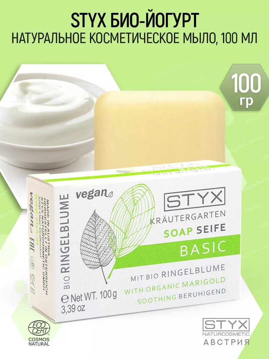 Styx Natural Yogurt Cosmetic Soap, 100g. Indications: Ideal care for sensitive skin, including children's. Gently cleanses, brightens, and softens the skin, eliminating sebum plugs and comedones. Slightly whitens and tightens pores. Styx natural cosmetic soap does not contain synthetic surfactants. Its creamy lather is formed by 4 types of surfactants obtained from vegetable fats (coconut, shea, cocoa, jojoba), soap root, algae, aloe, and licorice. While cleansing the skin, amphoteric surfactants neutralize aggressive water components, maintaining its pH. Being superfatted (triglycerides, enzymes, and essential oils of patchouli and vetiver), the soap restores the hydrolipidic mania of the epidermis. Application: This cosmetic soap is suitable for daily face and body hygiene, as well as for cleansing masks: after whipping up a lather, apply to porous areas of the skin under a film for 5 minutes, then rinse with water. Active ingredients: bio-yogurt, farnesol, natural surfactants. Full composition: amyl cinnamal (natural flavor, jasmine), benzyl salicylate, yogurt, cinnamic alcohol, coumarin, sodium palmate (natural surfactant), sodium chloride, palmitic acid, tetrasodium etidronate, citronellol, benzyl alcohol, water, geraniol, glycerin, linalool, perfume composition. Manufacturer: Styx, Austria. Brand: styx