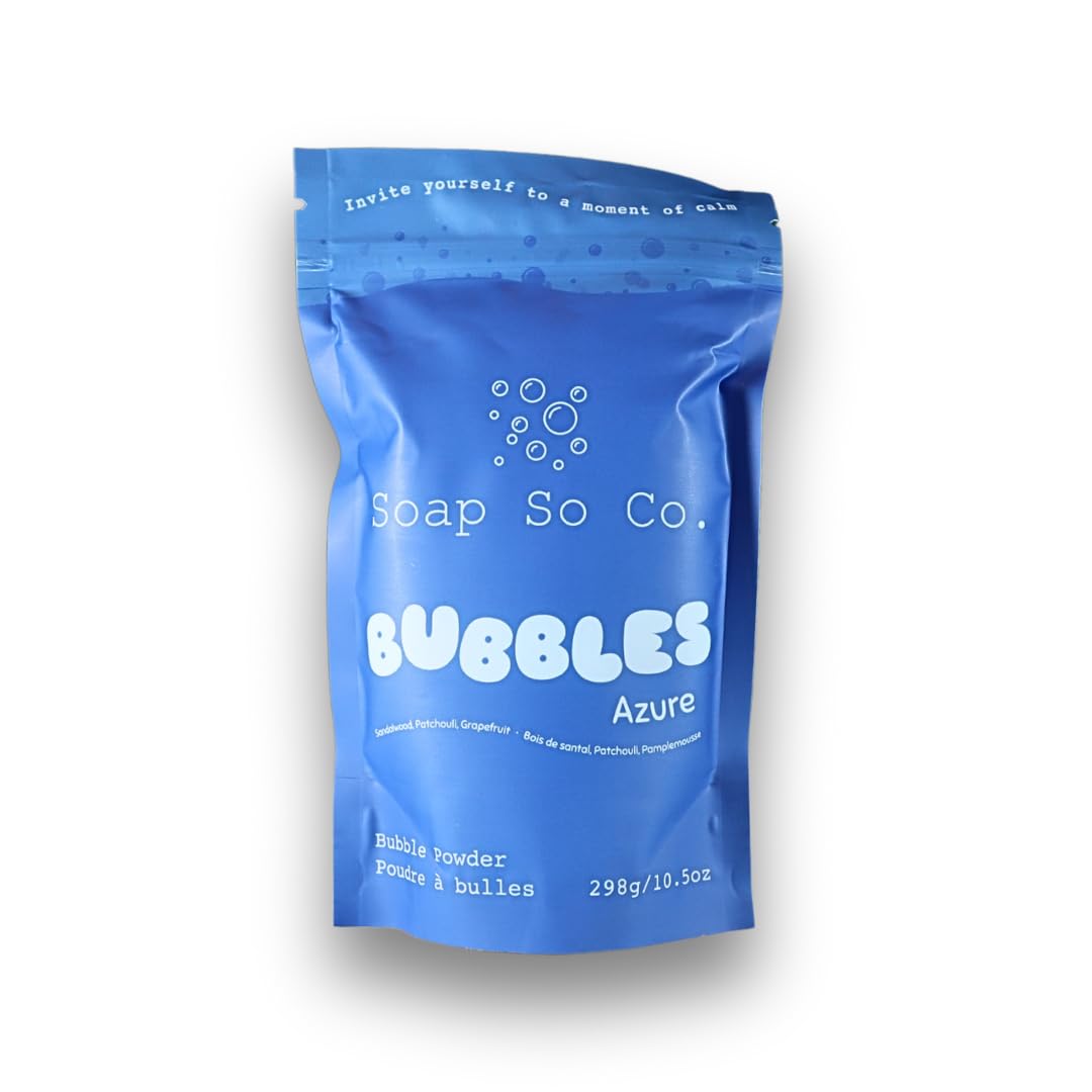 Soap So Co. Bubble Bath Powder Azure - Sandalwood Patchouli and Grapefruit Scent | Long-lasting Bubbles | Vegan | Paraben free | Phthalate free | Cruelty free | Made in Canada | 298g