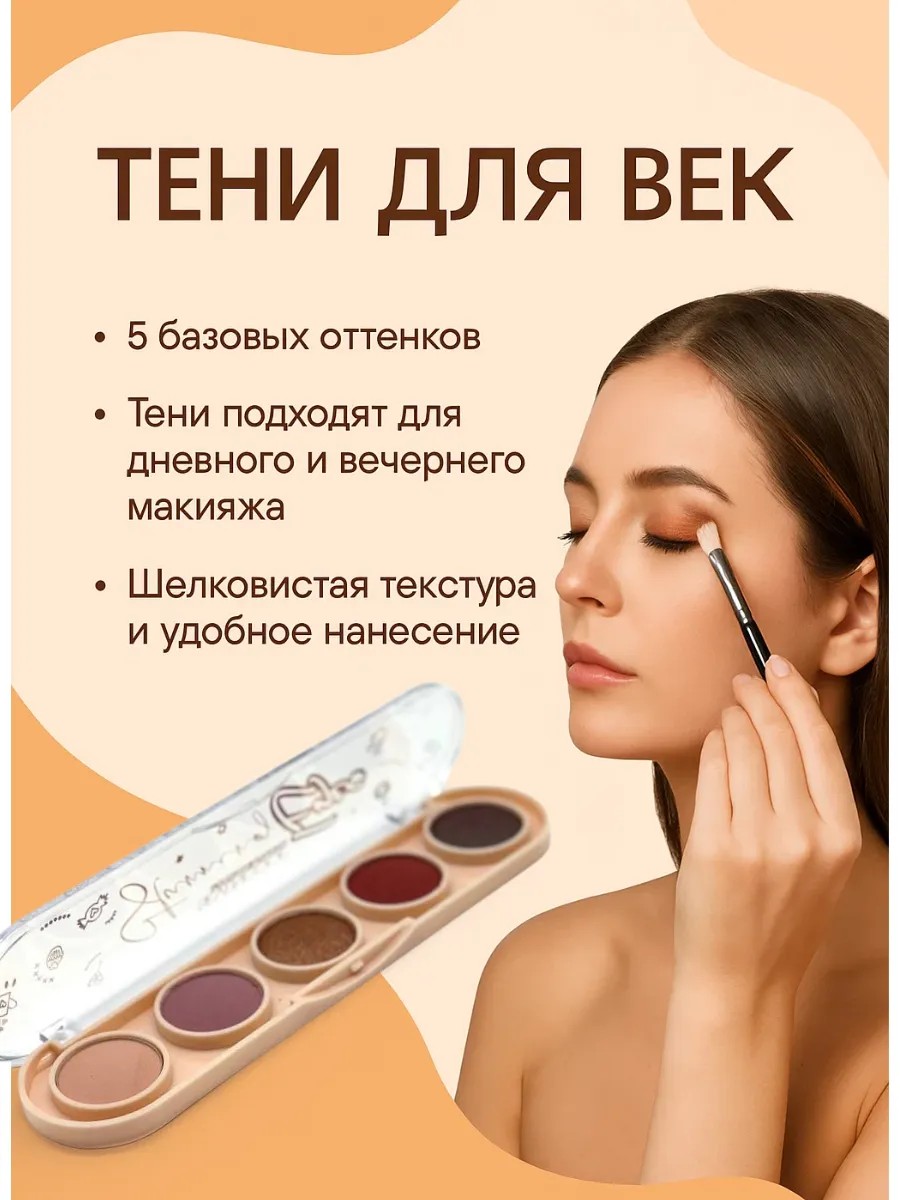 Тени для век — это базовый элемент в любой косметичке, позволяющий создавать как повседневные, так и вечерние образы. Эта палетка включает пять универсальных оттенков: от светлого бежевого до насыщенного шоколадного и глубокого винного, благодаря чему она подойдёт для любых цветотипов и цветовых предпочтений. Высокая пигментация обеспечивает яркий цвет с первого нанесения, а мягкая текстура делает их идеальными для растушёвки и плавных переходов между оттенками.