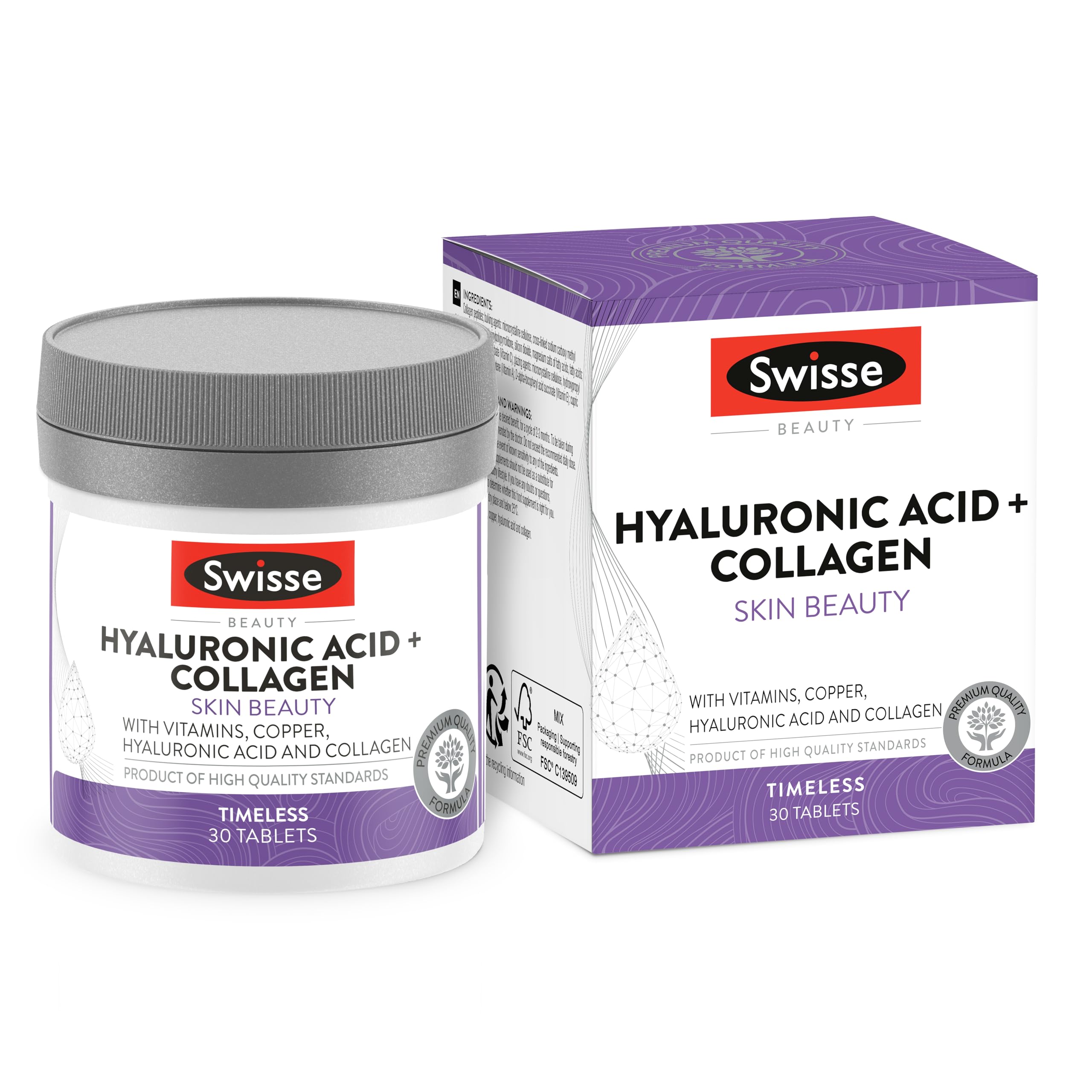 Dietary supplement designed to work from within and support healthy skin. Reduces wrinkles and promotes skin elasticity. Collagen peptides help reduce the appearance of fine lines and wrinkles and support skin elasticity. The beneficial effect is achieved by taking 3 tablets daily. Vitamin C contributes to normal collagen formation for normal skin function. Collagen is an important structural protein that plays a role in connective tissue to maintain healthy skin function. The beneficial effect is achieved by taking 1 tablet daily. Vitamins E, C, and copper contribute to the protection of cells from oxidative stress. The beneficial effect is achieved by taking 1 tablet daily. Take 1 to 3 tablets daily, depending on the desired benefit for a 2-3 month cycle. Take with or immediately after meals, or as directed by your doctor. Dietary supplement with vitamins, copper, hyaluronic acid and collagen. 30 tablets of 1415 mg Founded in Australia in the late 1960s, Swisse now has over 50 years of experience in the world of nutritional supplements. It is committed to continually investing in independent scientific research and development of new products made to high quality standards, to complement your diet and help you live better every day INGREDIENTS Collagen peptides bulking agents: microcrystalline cellulose, cross-linked sodium carboxymethylcellulose anti-caking agents: polyvinylpyrrolidone, silicon dioxide, magnesium salts of fatty acids, fatty acids sodium hyaluronate calcium L-ascorbate (Vitamin C) coatings: microcrystalline cellulose, hydroxypropyl methylcellulose, fatty acids beta-carotene (Vitamin A) D-alpha-tocopheryl acid succinate (Vitamin E) copper gluconate (Copper). DIRECTIONS FOR USE Take one or three tablets daily, depending on the desired benefit, for a 2-3 month cycle, with or immediately after meals or as directed by a doctor. See MoreSWISSE, A SUPPORTER OF HEALTH AND WELLBEING FOR MORE THAN 50 YEARS: Swisse was founded in Australia in the late 1960s and has more than 50 years of experience in the field of nutritional supplements. The company continuously invests in independent scientific research and in the development of new products that meet high quality standards to supplement your diet and help you get the most out of life every day. USAGE AND WARNINGS: One to three tablets per day, depending on the desired effect, for a period of 2-3 months. To be used during or immediately after meals, or as recommended by a health professional. Dietary supplement with vitamins, copper, hyaluronic acid and collagen. 30 tablets of 1415 mg. PROTECTS AGAINST OXIDATIVE STRESS: Vitamin E, C and copper contribute to the protection of cells against oxidative stress. The beneficial effect is obtained with a daily intake of 1 tablet. PROMOTES COLLAGEN FORMATION: Vitamin C contributes to normal collagen formation for the normal functioning of the skin. Collagen is an important structural protein that plays a role in connective tissue and helps maintain healthy skin function. The beneficial effect is obtained with a daily intake of 1 tablet. SWISSE BEAUTY HYALURONIC ACID AND COLLAGEN REDUCES THE APPEARANCE OF WRINKLES: Supplement formulated to work from within and support the health of your skin. Collagen peptides help reduce the appearance of fine lines and wrinkles and support skin elasticity. The beneficial effect is obtained with a daily intake of 3 tablets.SWISSE Collageen en Hyaluronzuur - Collageensupplement met Vitamine C E Koper, 30 Tabletten, Beschermt tegen Oxidatieve Stress voor een Elastische Huid, Rimpelverminderend Supplementen, Made in Italy normaal Voedingssupplement ontwikkeld om van binnenuit te werken en de gezondheid van je huid te ondersteunen. Vermindert rimpels en bevordert de elasticiteit van de huid. Collageenpeptiden helpen het ontstaan van fijne lijntjes en rimpels te verminderen en de elasticiteit van de huid te ondersteunen. Het weldadige effect wordt bereikt door dagelijks 3 tabletten in te nemen. Vitamine C draagt bij aan de normale collageenvorming voor een normale huidfunctie. Collageen is een belangrijk structuureiwit dat een rol speelt in bindweefsel om de functie van de huid gezond te houden. Het weldadige effect wordt bereikt door dagelijks 1 tablet in te nemen. Vitaminen E, C en koper dragen bij aan de bescherming van cellen tegen oxidatieve stress. Het weldadige effect wordt bereikt door dagelijks 1 tablet in te nemen. Neem 1 tot 3 tabletten per dag in, afhankelijk van het gewenste voordeel voor een cyclus van 2-3 maanden. Neem het in tijdens of direct na de maaltijd of op advies van uw arts. Voedingssupplement met vitaminen, koper, hyaluronzuur en collageen. 30 tabletten van 1415 mg Swisse werd eind jaren 60 in Australië opgericht en heeft vandaag meer dan 50 jaar ervaring in de wereld van voedingssupplementen. Het streeft ernaar om voortdurend te investeren in onafhankelijk wetenschappelijk onderzoek en ontwikkeling van nieuwe producten die volgens hoge kwaliteitsnormen zijn gemaakt, om je voeding aan te vullen en je te helpen elke dag beter te leven INGREDIËNTEN Collageenpeptiden vulstoffen: microkristallijne cellulose, vernette natriumcarboxymethylcellulose antiklontermiddellen: polyvinylpyrrolidon, siliciumdioxide, magnesiumzouten van vetzuren, vetzuren natriumhyaluronaat calcium-L-ascorbaat (Vitamine C) coatings: microkristallijne cellulose, hydroxypropylmethylcellulose, vetzuren bètacaroteen (Vitamine A) D-alfa- tocoferylwaterstofsuccinaat (Vitamine E) kopergluconaat (Koper). GEBRUIKSAANWIJZING Een of drie tabletten per dag in te nemen, afhankelijk van het gewenste voordeel, gedurende een cyclus van 2-3 maanden, tijdens of direct na de maaltijd of op aanbeveling van de arts Meer bekijkenSWISSE, AL MEER DAN 50 JAAR SUPPORTER VAN GEZONDHEID EN WELZIJN: Swisse werd eind jaren Zestig opgericht in Australië opgericht en heeft inmiddels meer dan 50 jaar ervaring op het gebied van voedingssupplementen. Het bedrijf investeert voortdurend in onafhanke