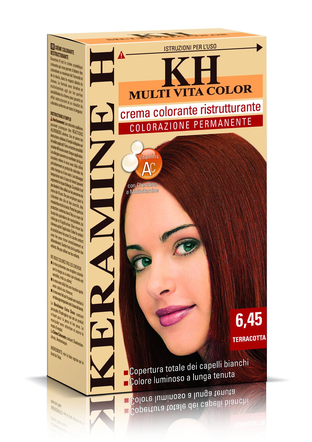 Cosmetic color cream that makes it possible to achieve colors that have maximum intensity and durability while fully respecting the hair. The keratin-based formula. Multivitamins. Works in the sensitive areas of the hair to ensure a restructuring effect and an even color result over the entire length.Do not wipe with shampoo. 100 covers gray hair. Long lasting, bright color. Restructuring cream based on keratin and multivitamins.Keramine H Terracotta, 330 ml, 3 verpakkingen à 110 ml Cosmetische kleurcrème die het mogelijk maakt om kleuren te bereiken die maximale intensiteit en duurzaamheid hebben met volledige inachtneming van het haar. De formule op basis van keratine. Multivitamines. Werkt in de gevoelige delen van het haar om een herstructurerende werking en een gelijkmatig kleurresultaat over de gehele lengte te garanderen.Niet met shampoo afvegen. 100 bedekt grijs haar. Duurzame, heldere kleur. Herstructurerende crème op basis van keratine en multivitamines.