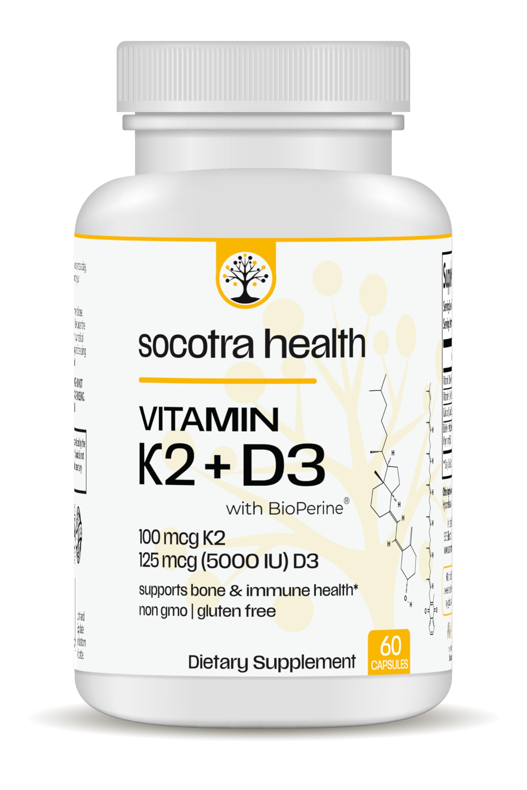 Suplemento de Vitamina D3 con K2 - 5000 IU de D3 y 100 mcg de K2 (MK7) para la salud ósea y articular - Apoya el bienestar inmunológico y cardíaco - Alta potencia - Sin gluten - 60 cápsulas. Superior Quality: Our D3 and K2 supplements are 3rd party tested and certified, free from fillers, artificial colors, flavors, and soy. Gluten-free and made in the USA in a cGMP-compliant facility. Enhanced Absorption with BioPerine: Our formula includes BioPerine, a black pepper extract, to improve nutrient absorption, ensuring you get the full benefits of each ingredient. Vitamin K2 D3: A Winning Combo – D3 aids calcium absorption, while K2 directs calcium to your bones, not your arteries. Together, they support overall health. Daily Boost: Socotra Health's K2 D3 vitamin supplement delivers 5000 IU (125 mcg) of vitamin D3 and 100 mcg of vitamin K2 (MK7) in each capsule to support heart health, and immune function.