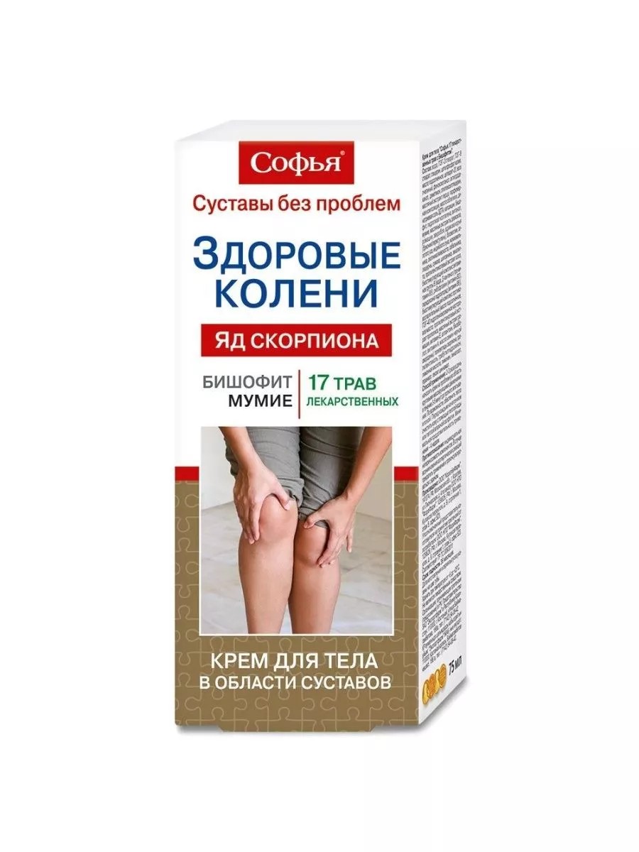 СОФЬЯ 17 ЛЕК ТРАВ С БИШОФИТОМ КРЕМ КОСМЕТИЧ Д/ТЕЛА 75МЛСофья (17 лекарственных трав/бишофит) крем для тела тела - натуральное эффективное средство. Эффективность подтверждена обширной многолетней практикой применения в России и за рубежом. активных компонентов:Яд скорпиона- обладает выраженным противовоспалительным и обезболивающим эффектом. Он активизирует механизмы регенерации хрящевой ткани и содействует комплексному оздоровлению опорно-двигательного аппарата. Яд скорпиона способствует быстрому восстановлению, а также сохранению здорового функционального состояния и торможению деструктивных процессов.Бишофит- природный полиминерал, в состав которого входят около 70 элементов. При заболеваниях суставов оказывает выраженное противовспалительное, болеутоляющее и регенерирующее действие, активизирует обменные процессы.Мумиё- уникальный природный биостимулятор. Стимулирует восстановительные процессы в суставах и пролиферацию клеток соединительных тканей, обладает противоотечным, противовоспалительным, иммуностимулирующим, общеукрепляющим действием.РезультатУлучшение функционального состояния, стимуляция активной регенерации тканей и нормализации метаболизма в тканях.крем наносить на тело легкими круговыми движениями в течение 3-5 минут до полного впитывания 2-3 раза в день.по возможности обеспечить тепло и покой.Крем предназначен для ежедневного использования. минимальная продолжительность применения - 4 недели.