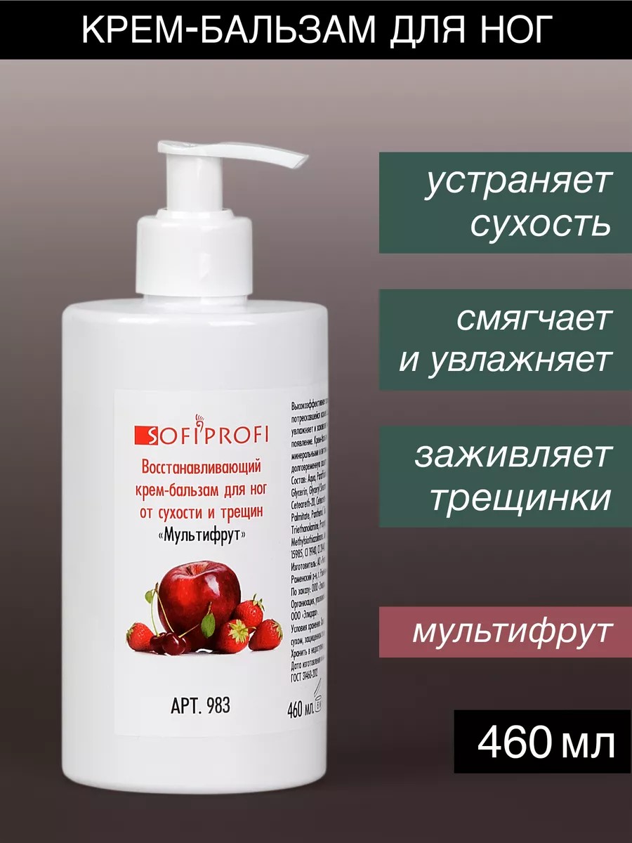 Восстанавливающий крем-бальзам для ухода за очень сухой, жесткой и потрескавшейся кожей ступней ног быстро и эффективно смягчает и увлажняет сухую кожу и заживляет мелкие трещинки, предупреждая их повторное появление. Состав этого бальзама для ног богат активными компонентами, минеральными и витаминными комплексами, которые обеспечивают долговременную защиту и комфортное состояние Ваших ног. Удобный дозатор сделает использование этого крема простым и удобным. Крем обладает очень приятным фруктовым ароматом.