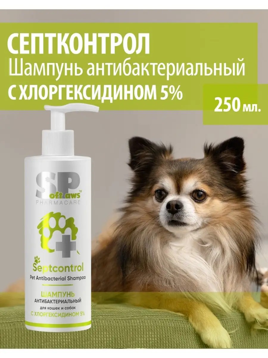 SEPTCONTROL Antibacterial Shampoo for Cats and Dogs with 5% Chlorhexidine. Gently cares for your pet's coat, keeping it clean and protecting it from pathogens. It is used for hygienic care and prevention of diseases caused by various types of protozoa, bacteria, and fungi, as well as for treatment of various dermatitis and fungal skin diseases. It prevents the proliferation of microorganisms, inhibits their growth, and significantly improves the pet's condition: it relieves skin itching, softens and moisturizes the skin, preventing flaking, and accelerates recovery. It promotes the healing of wounds, abrasions, and scratches. The antibacterial effect of chlorhexidine is enhanced by herbal extracts – chamomile, calendula, and St. John's wort – which have a beneficial effect on the skin, have anti-inflammatory and soothing properties, and relieve itching and flaking. D-panthenol and allantoin soften and nourish, stimulate regeneration processes, and have an overall beneficial effect on the skin, strengthening its natural defenses. Directions: Apply shampoo to damp fur, distribute evenly, and work into a rich lather. Leave on for 3-5 minutes, then rinse thoroughly with water. For preventative care, use 1-2 times a month; for treatment, use every 2-5 days, depending on the severity of your pet's condition.