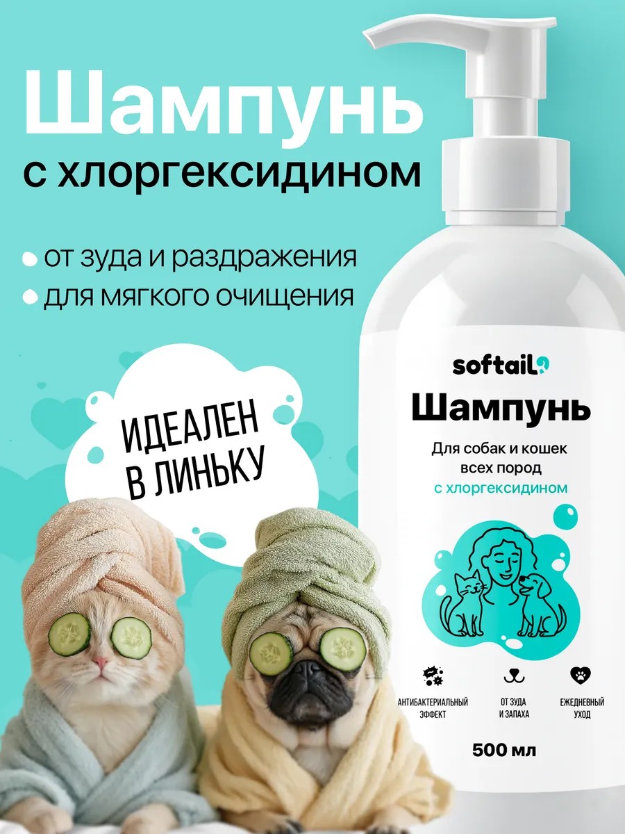 Шампунь с хлоргексидином для собак и кошек Softail предназначен для ежедневного ухода за питомцами, страдающих от воспалений и раздражений на коже.