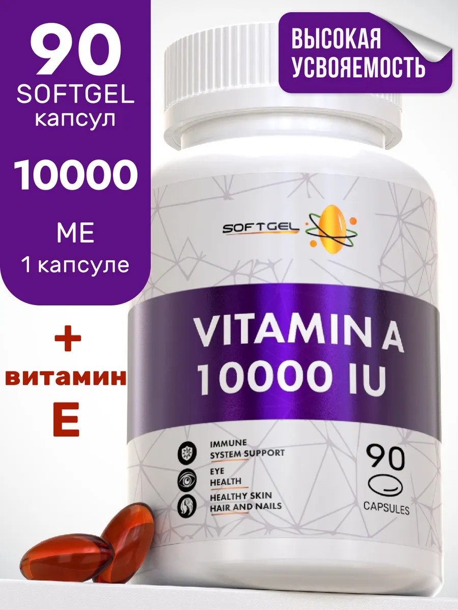 Vitamin A 10,000 IU from Softgel is a premium product, an essential element of your healthy lifestyle! Retinol, the main component, is essential for eye health and performs a number of vital functions in the human body. Without retinol, vision deteriorates (to the point of being unable to distinguish even large objects in a dimly lit room), and inflammatory processes in the retina develop. Vitamin A is an important vitamin for vision. It is a powerful antioxidant. It is involved in hematopoiesis; its deficiency increases the risk of anemia. Vitamin A capsules slow down the aging process of the skin. It activates collagen production, improving the elasticity and firmness of the epidermis. It is used in dermatology to treat skin diseases (acne, psoriasis), and in surgery to heal wounds and burns. Retinol acetate's ability to accelerate tissue regeneration is actively used in the body's recovery. It is included in anti-aging complexes. Directions: Take 1 capsule daily after meals. Ideal for both men and women. Explore our health supplements in store by clicking on the brand. We care about the quality of our products and manufacture them in accordance with the ISO 22000:2018 standard. Choose your health!