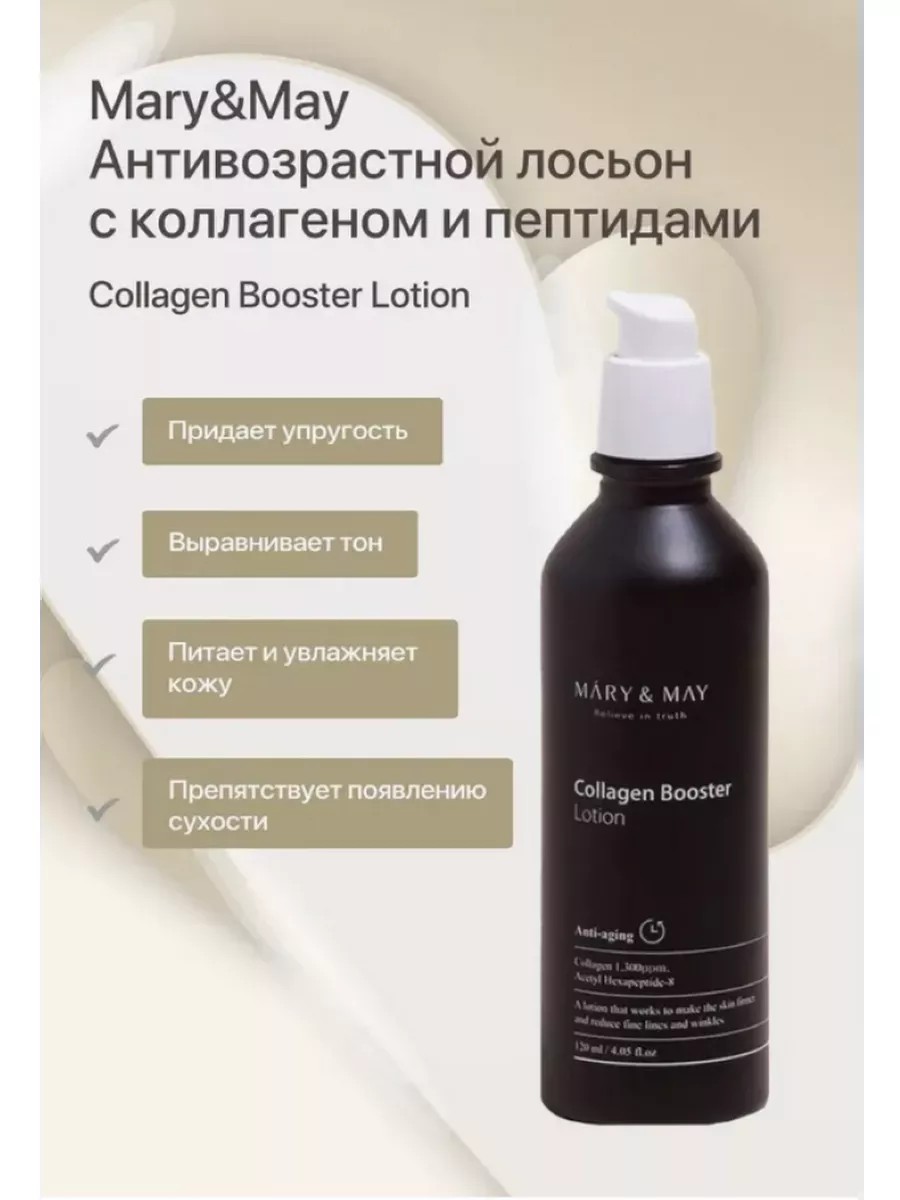 Антивозрастной лосьон-бустер с коллагеном и пептидами Mary&May Collagen Booster Lotion делает кожу более упругой и эластичной, сокращает глубину и количество морщин, делает овал лица более подтянутым. Препятствует появлению нежелательной пигментации, выравнивает тон и дарит коже красивое сияние.