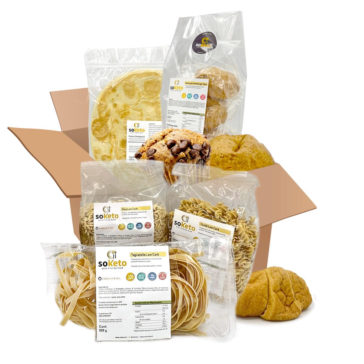 This is a 7-day kit for your ketogenic diet that will be truly easy thanks to our very low-carb products. To help you on your keto journey, we've included in this 7-day kit a variety of sweet and savory keto-friendly pasta and other keto-friendly products to cover all stages of the day, from keto breakfast to dinner, including a keto snack. Try it now! Free shipping on the 7-Day Keto Diet Pack, which contains various ketogenic and low-carb products: - 250 grams of ketogenic and low-carb shortcrust pastry - 250g Keto Chest Bread - Keto Sesame Seed Panino (2 x 60g pack) - Keto Piadina (2 x 85g pack) - Keto Croissant (2 x 50g pack) - Keto Croissant with Chocolate Cream Filling (2 x 50g pack) - Keto and Gluten-Free Grissini (3 x 30g pack) - 180g Keto Pizza - 300g Keto Cocoa and Hazelnut Spread INSTRUCTIONS Cook the keto pastry as you would traditional pastry, but without adding starch or other carbohydrates. Cook in boiling water for 8 to 10 minutes, or until firm to the bite. You can also sauté in a pan with oil and season to your liking.