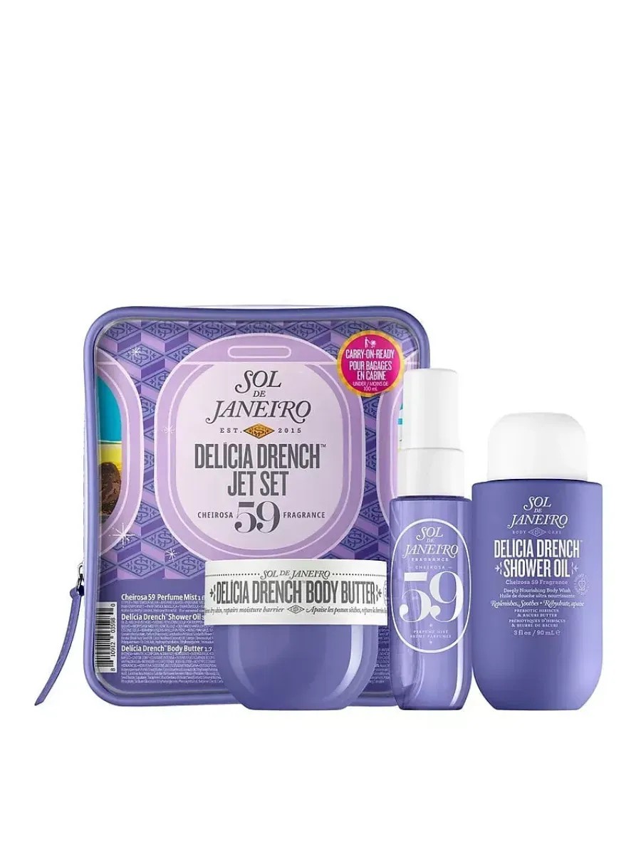 A travel-friendly, intensely hydrating collection with three products from the Delícia Drench collection, featuring the invigorating Cheirosa 59 scent. Fragrance type: Warm and sweet gourmand Key notes: Sugar violet, vanilla orchid, and sandalwood The set includes: Delícia Drench Shower Oil (90 ml) Delícia Drench Body Oil (50 ml) Cheirosa ’59 Perfume Mist (30 ml) This set contains three products with a powerful hydrating effect. Delícia Drench Shower Oil is a milky oil that leaves skin soft and supple. It is accompanied by the popular Delícia Drench Body Oil, which helps restore the skin’s moisture barrier and maintain a healthy microbiome. The body care ritual is completed by the wonderfully refreshing and uplifting* scented Cheirosa ’59 Perfume Mist. The products are packaged in a branded Jet Set cosmetic bag, which can be used both on the beach and anywhere else.