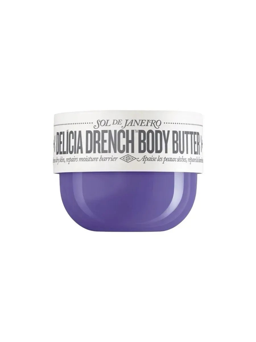 Sol de Janeiro 59 Delicia Drench body butter helps soothe dry and flaky skin. It's a whirlwind of moisture that bursts forth, leaving your body's skin properly nourished and silky. A soothing complex helps relax tense skin, while bacuri oil strengthens the skin's protective barrier. Bacuri oil replenishes the skin's protective barrier, while an innovative Brazilian soothing complex—a blend of copaiba resin and passionflower seed oil—calms stressed skin. Prebiotic hibiscus nourishes the skin's natural microbiome, supporting its resilience.