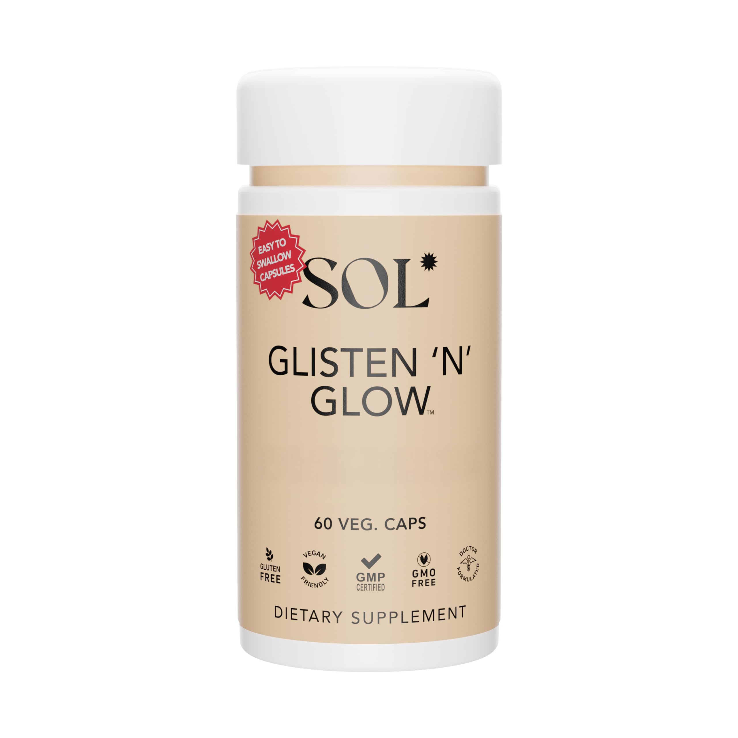 Sol Nutrition Glisten N Glow Supplement: Skin Vitamins for Women Biotin, Collagen & Skin-Loving Vitamins A, B, C, E for Clear Complexion & Youthful Glow, 60 Easy to Swallow Capsules