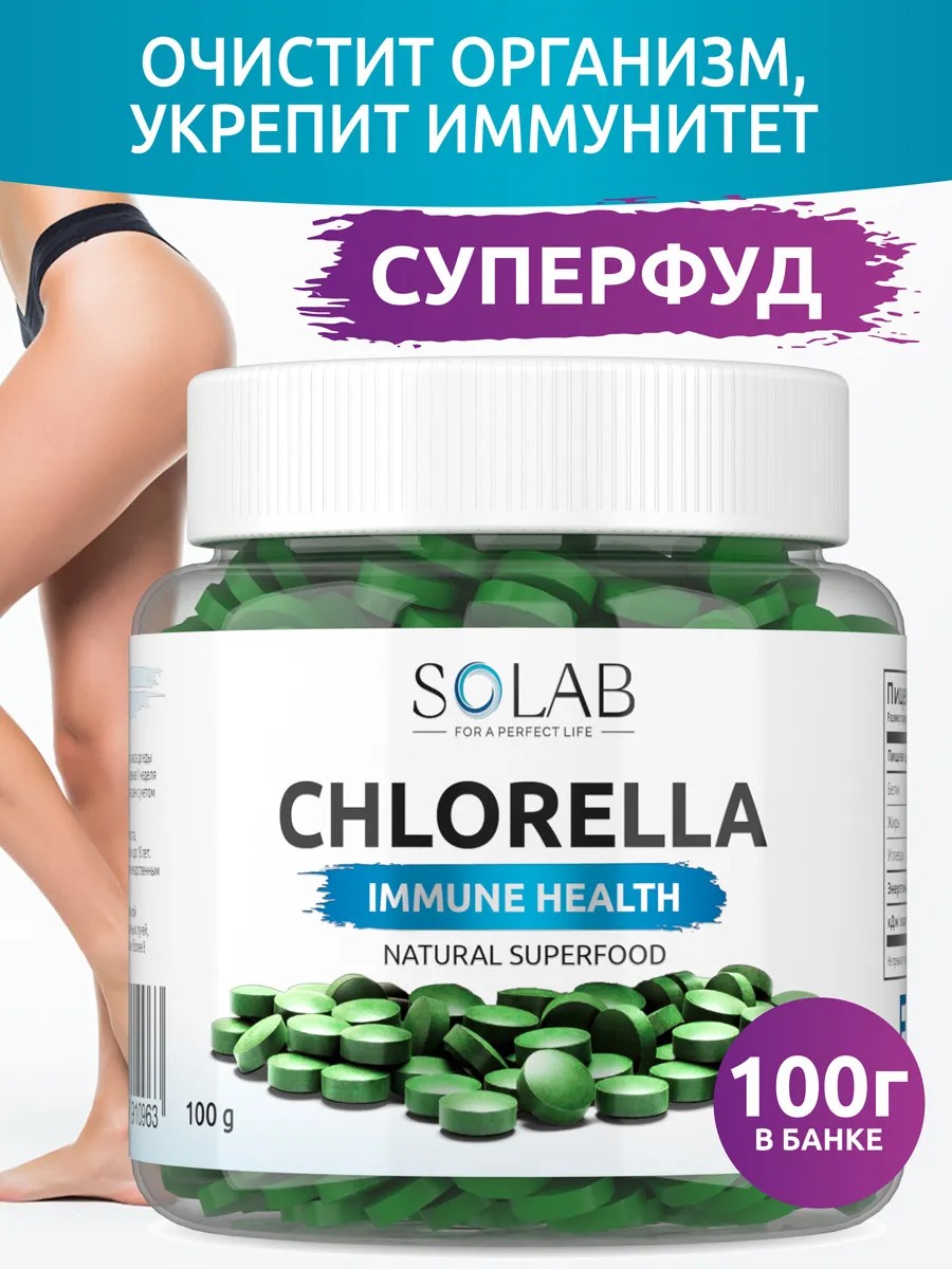 Хлорелла в таблетках от SOLAB — это уникальный, полезный суперфуд для бережной детоксикации организма, который также подходит для веганов и вегетарианцев. В одной порции (4 таблетки) содержится 60 мг хлорофилла, 3 мг каротиноидов, 100 мг фикоцианинов и витамины В7, В9, В12.