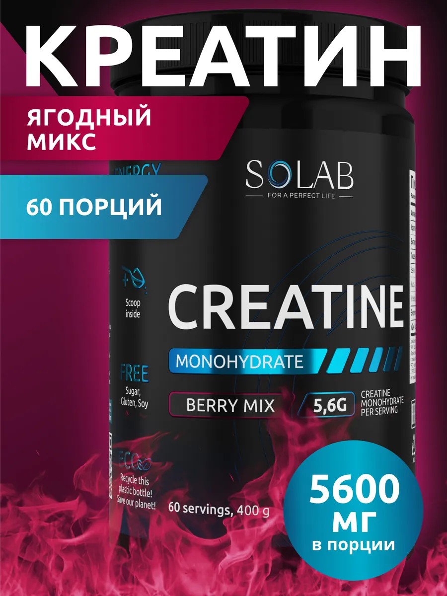 SOLAB Creatine Monohydrate — 100% моногидрат креатина в порошковой форме. Характеризуется максимальным содержанием действующего вещества, является самой распространенной формой крeaтина. Порошок с приятным вкусом лесных ягод имеет большое количество положительных отзыв об эффективности и качестве. Спортивное питание.