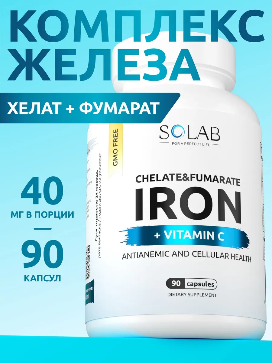 SOLAB Железо витамины 2 в 1 хелат + фумарат, 90 капсул, 40 мг