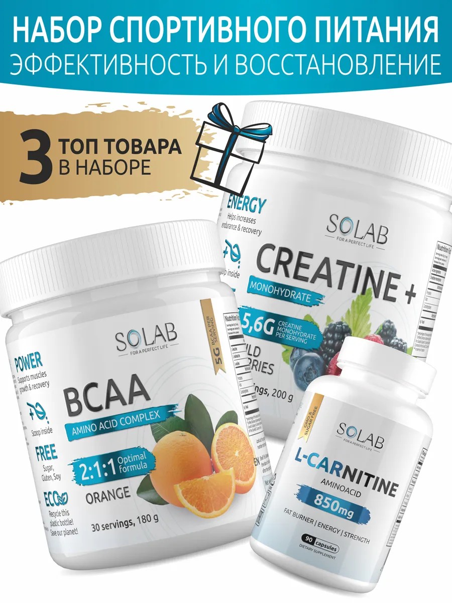 | Комплектация | BCAA - 1 упаковка; Креатин -1 упаковка; L-карнитин - 1 упаковка |