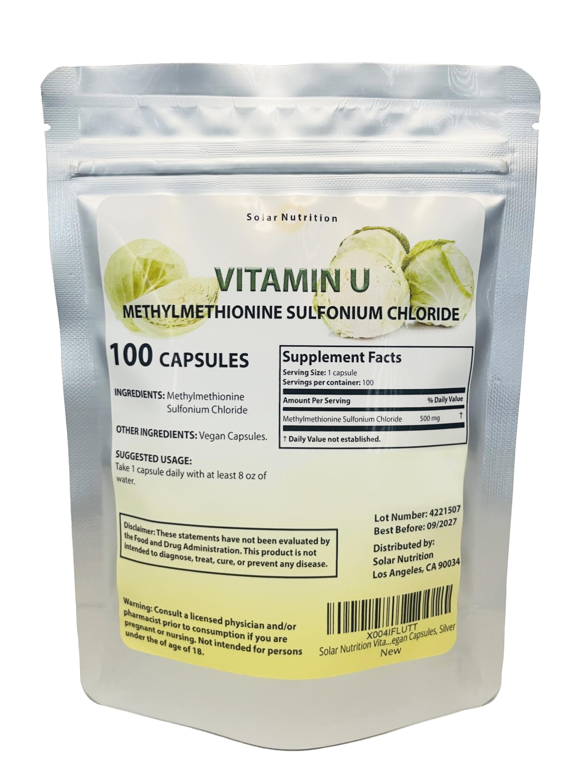Solar Nutrition Vitamin U Methylmethionine Sulfonium Chloride 500 mg 100 Vegan Capsules Silver