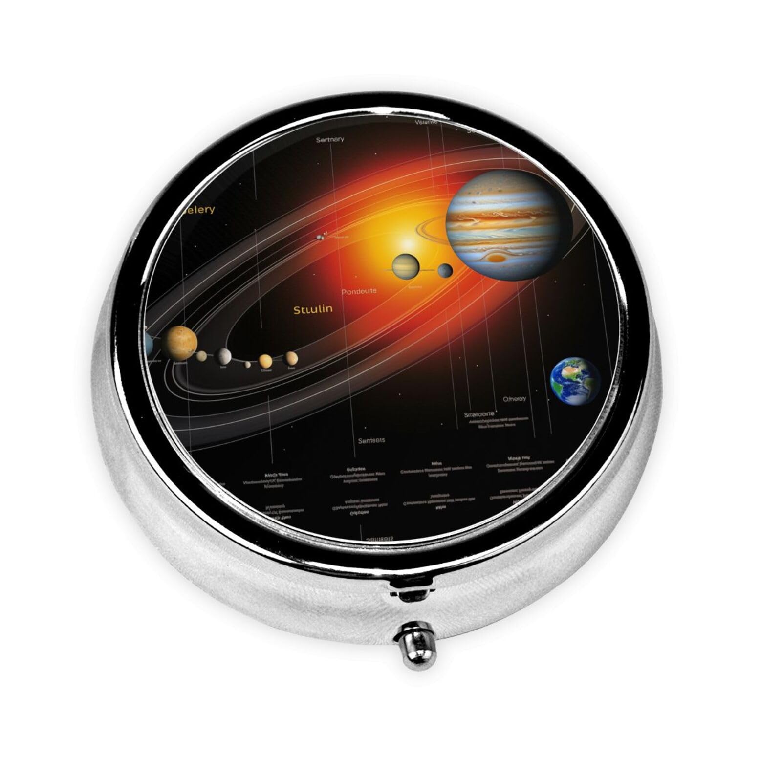 Wide range of applicable scenarios: suitable for use in various occasions such as home, office, and travel, providing you with convenient drug storage solutions. Multi-grid plastic inserts: The medicine box is designed with 3 plastic inserts inside, which can separate and store different types of pills, making them more organized and convenient to use. Convenient opening button design: The medicine box button design is easy to open, convenient and fast, and simple to operate, allowing you to easily access the medicine. Environmentally friendly metal material: Made of environmentally friendly metal iron plating material, it is durable, safe and reliable, and protects medicines from damage. Solar system planet map Portable mini design: round mini pill box, measuring 2.0x2.0x0.7 inches, lightweight and portable, suitable for carrying in pockets and purses, providing you with urgently needed medicines anytime and anywhere.