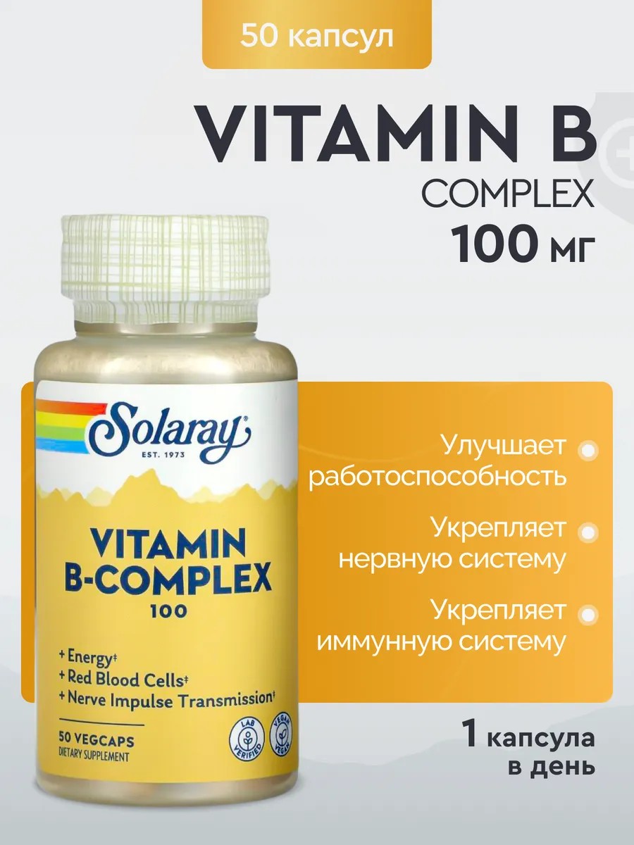 Группа важных водорастворимых витаминов с аналогичными функциями в организме, витамины группы В помогают поддерживать здоровье волос и кожи, нормальную передачу нервных импульсов, функцию иммунной системы и здоровое образование эритроцитов. Они также работают вместе, чтобы поддерживать метаболизм углеводов, жиров и белков для получения энергии. Поскольку большинство витаминов группы В не запасаются в организме, важно получать эти питательные вещества с пищей. Вот почему Solaray предлагает наш комплекс витаминов группы В 100: сочетание всех восьми витаминов группы В в одной очень простой порции. Стремясь создавать качественные добавки, которые просто работают лучше, мы включили выращенную на солнце основу Whole Food Base из концентрата цельного риса и геля алоэ вера для дополнительного питания, а также холин и инозитол для здоровой поддержки нервной системы. Применять только согласно указаниям. Принимайте одну вегетарианскую капсулу с едой или стаканом воды. витамины соларей; соларей; solaray; витамины бренда solaray; solaray витамины; комплекс витаминов б, комплекс Б витаминов, б комплекс