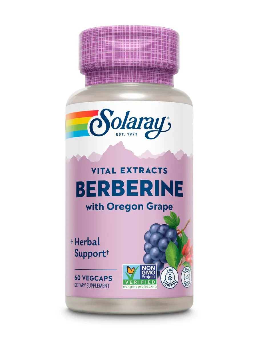 Solaray Berberine with Oregon Grape is a botanical complex containing berberine and Oregon grape extract. Berberine is known for its anti-inflammatory, antioxidant, and metabolic properties, helping to maintain normal blood sugar levels, heart health, and immunity. Oregon grape extract enhances the effects of berberine, supporting liver and digestive function. Directions: Take 1 capsule 1-2 times daily with meals with water, or as recommended by a healthcare professional. Ingredients: Berberine from barberry root extract - 500 mg.