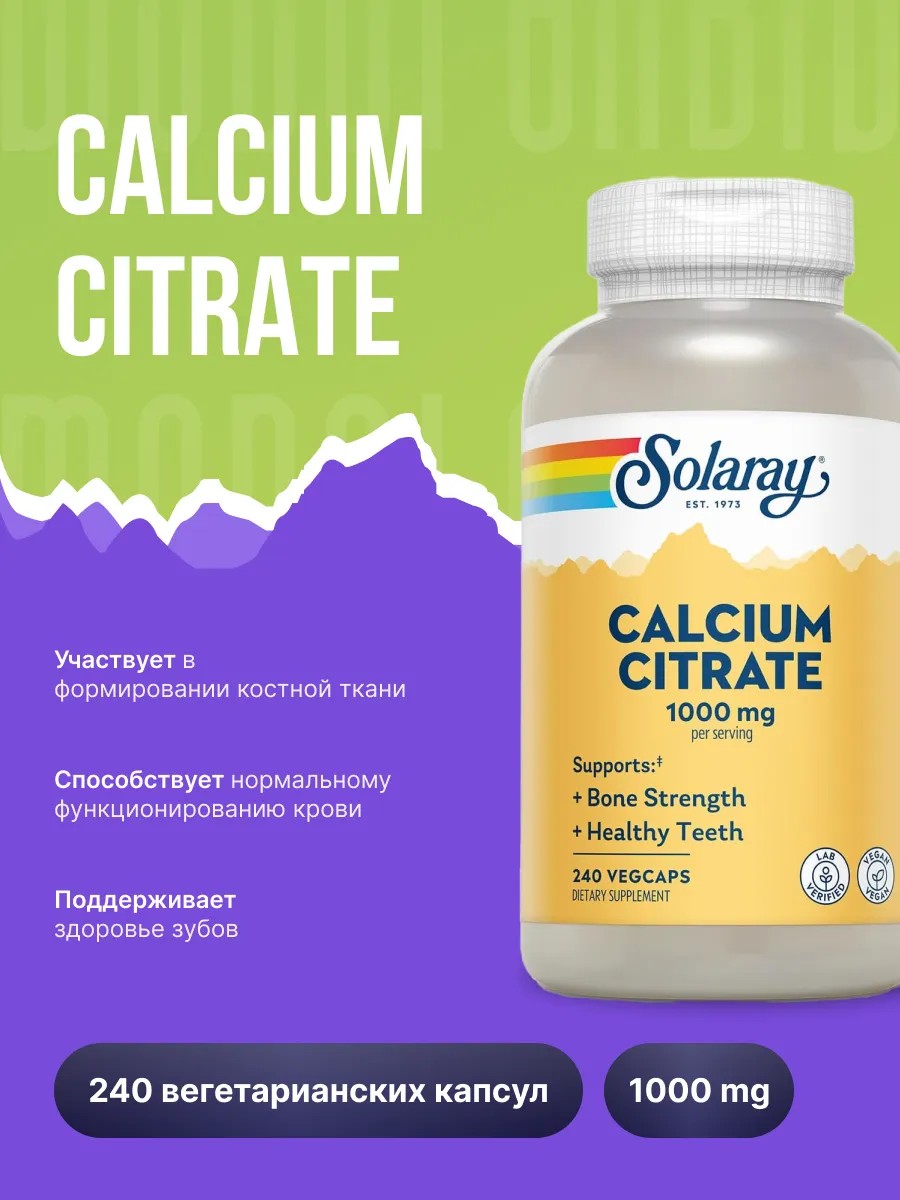 Solaray Calcium Citrate 1000 мг - это вегетарианская добавка, предоставляющая 1000 мг цитрата кальция в каждой из 120 капсул. Кальций - важный минерал, необходимый для поддержания крепких костей и здоровых зубов, а также для многих других функций организма. Этот продукт обеспечивает удобный способ удовлетворить потребности организма в кальции и поддержать его общее здоровье.