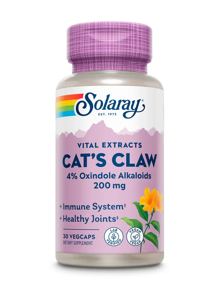 Cat's claw, also known as una de gato and native to the ancient Inca civilization, is a woody vine named for the sharp, curved spines on its stems. Cat's claw may support joint and immune health. Ingredients: Cat's claw (Uncaria tomentosa) (bark extract) (guaranteed 8 mg [4%] total oxindole alkaloids) - 200 mg; Cat's claw (Uncaria tomentosa) (bark) - 200 mg. Directions: Use only as directed. Take 1 VegCap daily with a meal or glass of water.