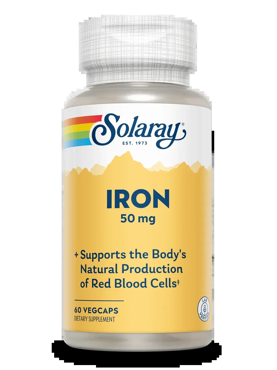 Solaray Iron is a highly effective iron supplement containing 50 mg of iron per capsule. It's ideal for replenishing iron deficiency, preventing anemia, and supporting overall health. Directions: Take 1 capsule daily with water during meals, or as recommended by a healthcare professional. Ingredients: Iron (as iron amino acid chelate) - 50 mg.