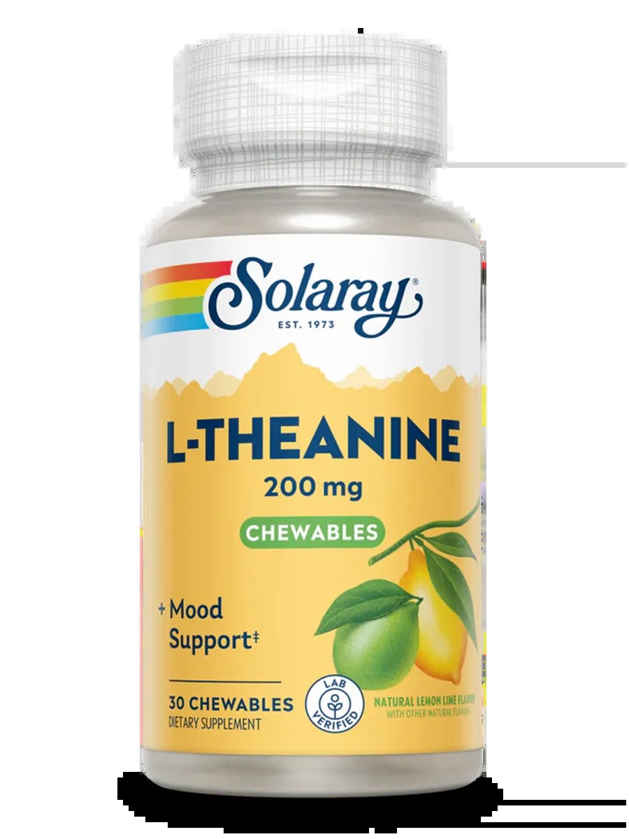 Solaray L-Theanine 200 mg is a supplement containing the amino acid L-theanine, which promotes relaxation, improves mood, and reduces stress without causing drowsiness. L-theanine may support cognitive function by reducing anxiety and tension. Directions: Take 1 capsule daily with food or water. Ingredients: Vitamin B6 (as pyridoxine hydrochloride) - 20 mg; L-theanine - 200 mg.
