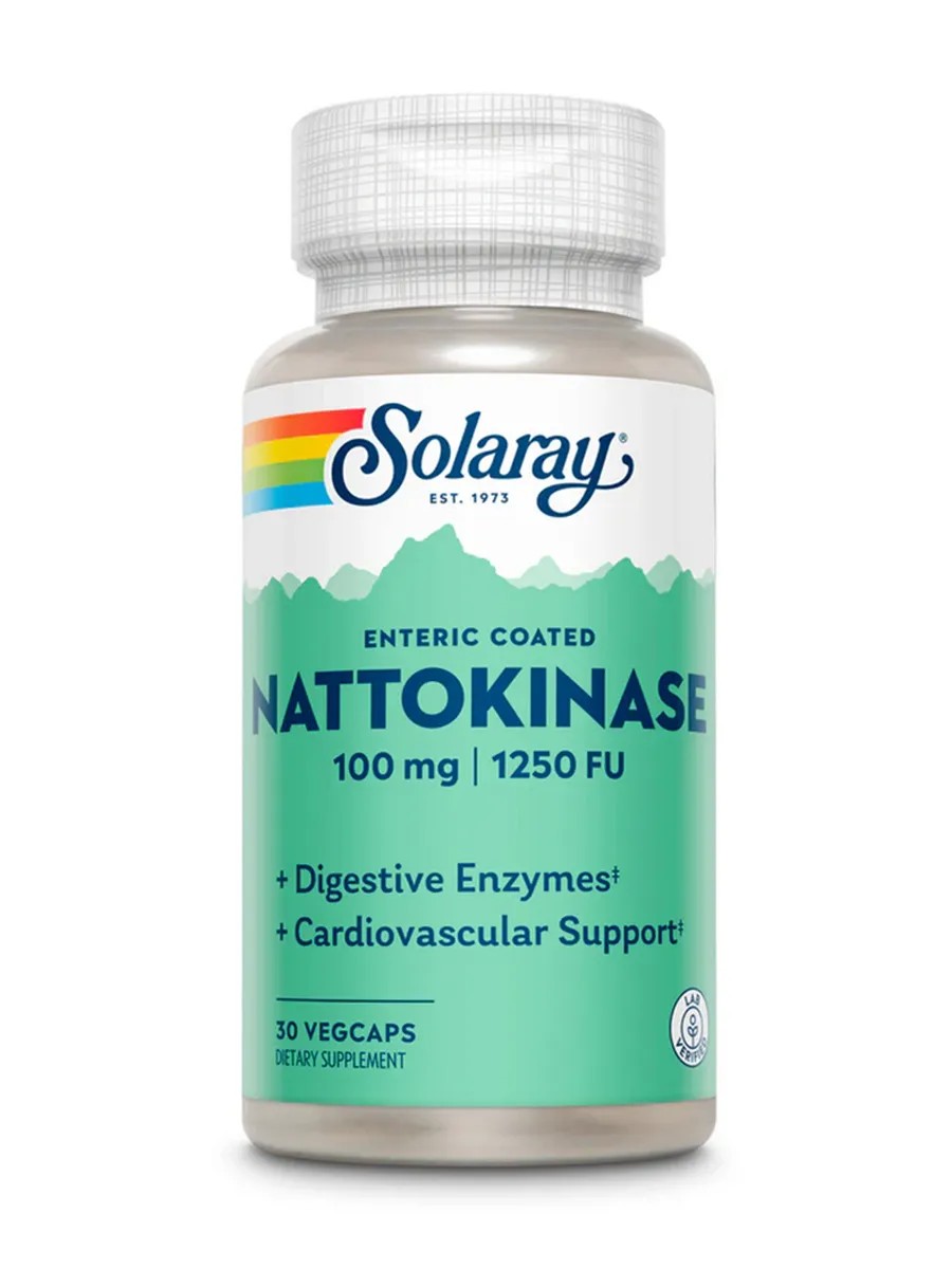 Solaray Nattokinase is a natural enzyme derived from the traditional Japanese dish natto. Nattokinase supports cardiovascular health, improves circulation, normalizes blood viscosity, and reduces the risk of blood clots. This enzyme helps maintain overall circulatory tone and protects blood vessels from damage. Directions: Take 1 capsule daily on an empty stomach with water, or as recommended by a healthcare professional. Ingredients: Nattokinase (from fermented soybeans) – 100 mg.