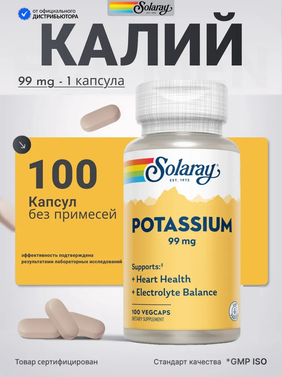 Solaray Калий Potassium 99 мг, 100 капсул восполняет дефицит минерала в организме, поддерживая работу сердечно-сосудистой и нервной системы. Пищевая добавка обеспечивает гидратацию организма и нормальный сердечный ритм, улучшает тонус сосудов и поддерживает здоровье нервов.