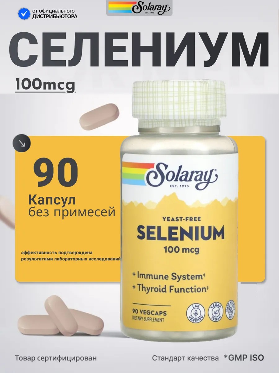 Solaray Cелен Selenium Yeast-free 100 мкг, 90 капсул – биологически активная добавка, созданная для укрепления иммунитета и поддержания работы щитовидной железы.