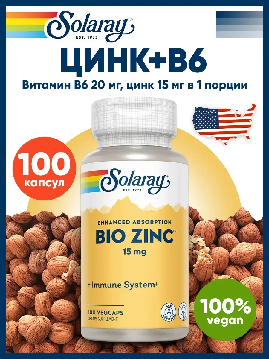 Цинк 15мг Solaray, 100 капсул, для зрения, иммунитета, кожи, мышц, обмена веществ. **ПРЕИМУЩЕСТВА:** - повышает иммунитет, - биодоступная форма, - способствует здоровому функционированию глаз, предстательной железы, печени и многих других органов, - влияет на здоровье кожи и предотвращает выпадение волос, - является важнейшим компонентом для формирования более 200 ферментов, участвующих в широком диапазоне функций организма. Цинк - микроэлемент, который играет важную роль во многих метаболических функциях организма. Достаточный уровень цинка в организме помогает защитить клетки от окислительного повреждения и поддерживает их здоровое функционирование, а также общее здоровое старение организма. Исследования показали, что потребление цинка помогает поддерживать здоровье иммунной системы. Содержит биодоступную форму цинка в форме растительных капсул. **ПРИМЕНЕНИE:** по 1 капсуле в день во время еды или запивая стаканом воды. **ХРАНЕНИЕ:** Хранить в прохладном, сухом, темном месте недоступном для детей. Избегайте воздействия источников тепла и солнечного света. Используйте до завершения срока годности, рекомендованного производителем на упаковке. **ПРЕДУПРЕЖДЕНИЕ:** перед началом применения пищевых добавок в период беременности, кормления грудью, лицам, страдающим хроническими заболеваниями, людям преклонного возраста, лицам младше 18 лет, лицам, принимающим рецептурные препараты (например, антикоагулянты) или имеющим диагностированное врачом заболевание, следует проконсультироваться с врачом.