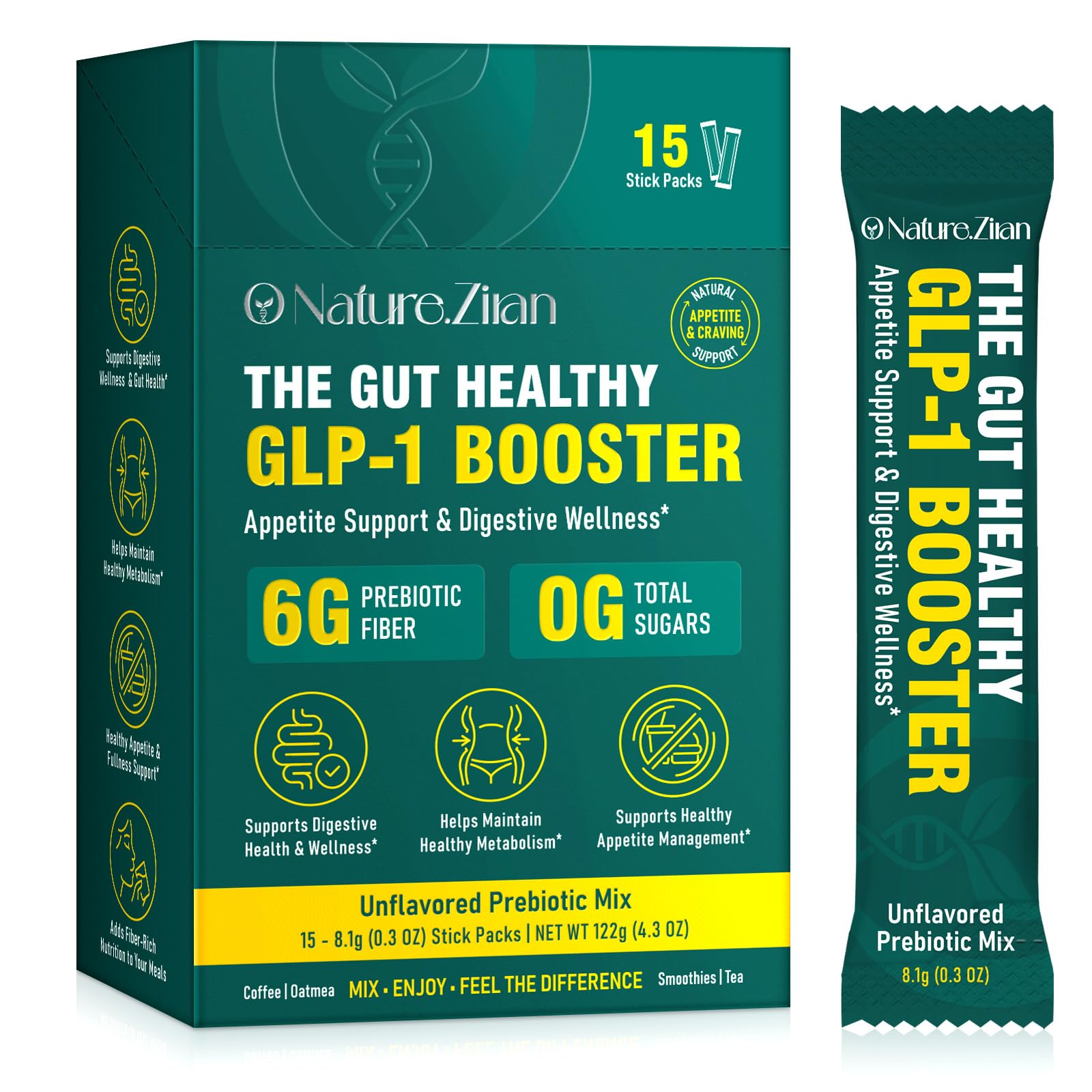 Onature.Ziran GLP-1 Booster Powder supports your digestive health with fiber-rich supplements, made with natural, gluten-friendly ingredients. Easily mix into meals or beverages for nutrition and lasting satisfaction - without compromising taste or texture. Introducing – The Gut Healthy GLP-1 Booster, your daily partner for appetite support, digestive wellness, and metabolic health. Crafted for those seeking a natural, effective way to nurture their gut, this unflavored prebiotic fiber mix seamlessly integrates into your routine, helping you feel balanced, satisfied, and energized from within. Each stick pack contains 6g of premium prebiotic fiber with 0g total sugars, designed to stimulate the body's natural GLP-1 production—a key hormone for appetite regulation and metabolic maintenance. By supporting healthy gut bacteria, our formula promotes smoother digestion, reduces occasional bloating, and fosters a thriving microbiome for long-term digestive health. Enjoy effortless daily use: simply tear, mix, and stir into your favorite hot or cold beverage—coffee, tea, smoothies—or blend into oatmeal, yogurt, or water. With no taste interference, it's the invisible boost your diet deserves. Whether you're managing appetite, optimizing digestion, or maintaining a healthy metabolism, NatureZilain offers a clean, plant-based, and non-GMO solution that fits seamlessly into a wellness-focused lifestyle.15 Convenient Stick Packs – Pre-measured single-serve sticks make dosing simple and portable. Ideal for travel, work, or home—just mix, enjoy, and feel the difference. Supports Digestive Wellness Gut Health – Helps improve digestion, reduce bloating, and strengthen the gut microbiome for enhanced immune function and overall digestive comfort. Easy Versatile Daily Use – Unflavored and dissolvable effortlessly mix into coffee, tea, oatmeal, smoothies, or water without altering taste. Perfect for on-the-go gut health. 6g Prebiotic Fiber with 0g Sugar – Each stick pack delivers 6g of pure prebiotic fiber to nourish gut bacteria, promote digestive health, and support regularity—all with no added sugars or artificial ingredients. GLP-1 Booster for Appetite Metabolism Support – Formulated to naturally enhance GLP-1 levels, helping manage cravings, support healthy appetite control, and maintain a balanced metabolism for overall wellness.