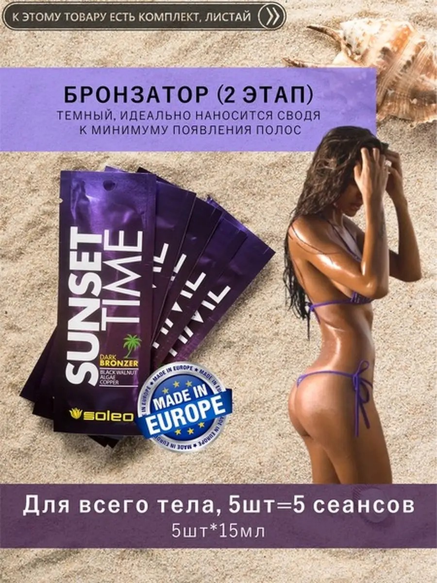 Attention! Before using tanning creams, choose the right one based on your skin type (see all photos). The set includes 5 sachets of 15 ml each. Professional tanning creams from SOLEO (Poland). Sunset Time impresses with a quick tan (thanks to DHA and walnut extract). It applies and distributes perfectly, minimizing streaks. It provides an even tan. It has a wonderful scent, transporting you to a world of comfort, joy, and relaxation. It provides excellent hydration, nourishment, and smoothing thanks to a combination of proven, highly effective active ingredients such as algae, copper, safflower oil, and aloe. THIS BRONZER WILL PERFECTLY STRENGTHEN YOUR TAN. You can also purchase other tanning supplies; scroll through the photos in the product card. Simply enter the item number of the product you like in the WB search. You can also click the button below the : "Go to the seller's store." Be beautiful and healthy!