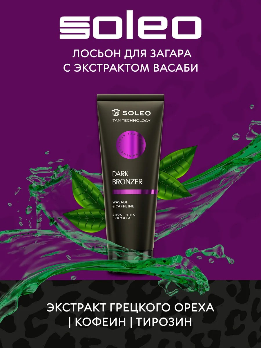 SOLEO TAN TECHNOLOGY Dark Bronzer – это способ эффективно углубить цвет загара и сделать шаг в будущее – эффект разглаживания кожи. Косметическое средство сочетает в себе уникальные ухаживающие ингредиенты – васаби и кофеин, которые придают коже сияющее сияние. Мощная доза активных ингредиентов позволяет добиться интенсивного загара, обеспечивая исключительную гладкость и длительное увлажнение.