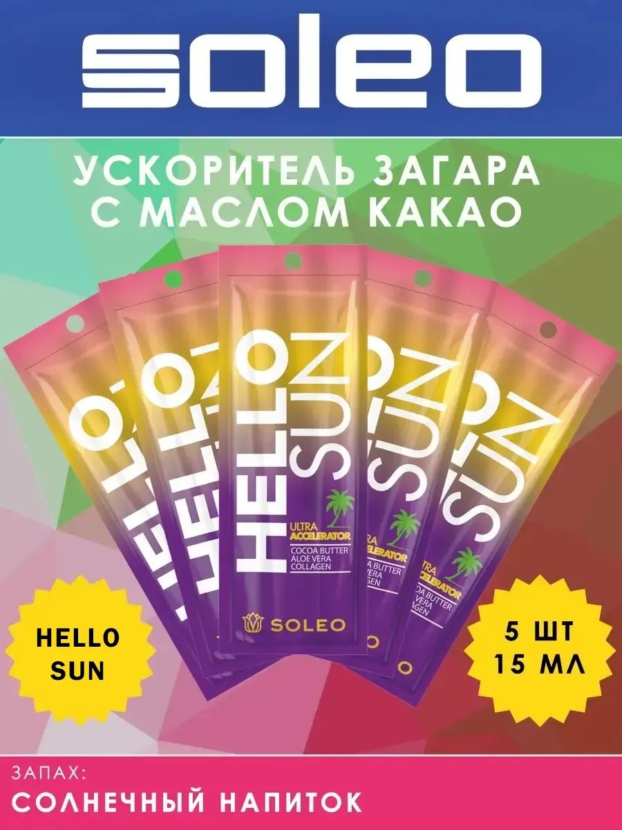 Ультра-ускоритель для загара Hello Sun Soleo с маслом какао увлажняет и тонизирует кожу, обеспечивает быстрый и ровный загар. Предотвращает проявление воспалительных процессов кожи и защищает от фотостарения.