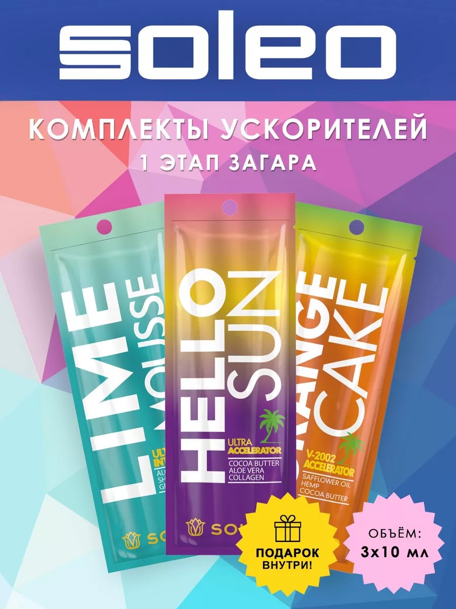 Включает в себя 3 саше по 15 мл. SoleoHELLO SUN+LIME MOUSSE+ORANGE CAKE