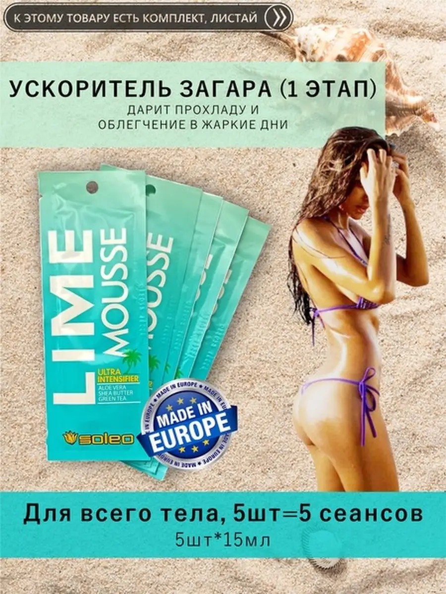 Внимание! прежде чем пользоваться кремами для загара правильно подберите подходящий Вам в зависимости от типа кожи(См. все фото).В комплекте саше 5шт по 15мл.Профессиональные крема для загара SOLEO(Польша).Ускоритель загара LIME MOUSSE позаботится о Вашем комфорте и ускорит появление естественной золотистой бронзы на коже. Для тех, кто любит освежающий лимонад, подарит Вам прохладу и облегчение в жаркие дни. Аромат легкой сладости лимонада, сопровождаемый кислым лимоном,-СТИМУЛИРУЕТ ЕСТЕСТВЕННЫЙ И СТОЙКИЙ РОВНЫЙ ЗАГАР-ЗАЩИЩАЕТ КОЖУ ОТ ОБЕЗВОЖИВАНИЯ, ПОДДЕРЖИВАЯ ОПТИМАЛЬНУЮ СТЕПЕНЬ УВЛАЖНЕНИЯ-ДЕЛЕТ КОЖУ МЯГКОЙ И ПРИЯТНОЙ НА ОЩУПЬ-ПРОТИВОДЕЙСТВУЕТ УСКОРЕННОМУ СТАРЕНИЮ КОЖИ БЛАГОДАРЯ ИНГРЕДИЕНТАМ, ОБЛАДАЮЩИМ ДЕЙСТВИЕМ ПРОТИВ СВОБОДНЫХ РАДИКАЛОВТак же можете преобрести другие расходники для посещения солярия, листайте фото в карточке товара. Просто введите артикула понравившегося Вам товара в поиске WB.Так же Вы можете нажать на кнопку ниже"Перейти в магазин продавца" под м товара