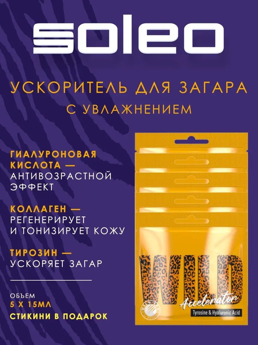 Ускоритель Soleo Wild с тирозином и гиалуроновой кислотой. Лосьон для загара в солярии с быстрым увлажняющим и бронзовым эффектом. Гиалуроновая кислота улучшает структуру кожи, обеспечивая ей интенсивное увлажнение и баланс. **Обогащенный тирозином и гиалуроновой кислотой, он** интенсивно увлажняет, питает и тонизирует кожу, очень успокаивает и успокаивает.**Активные ингредиенты:****тирозин** ускоряют процесс загара**гиалуроновая кислота** - улучшает структуру кожи**Нота аромата** цветок ГавайевНовый оригинальный товар.Комплект WILD TAN Wild Accelerator Ускоритель загара с гиалуроновой кислотой 15 мл*5шт+ подарок.