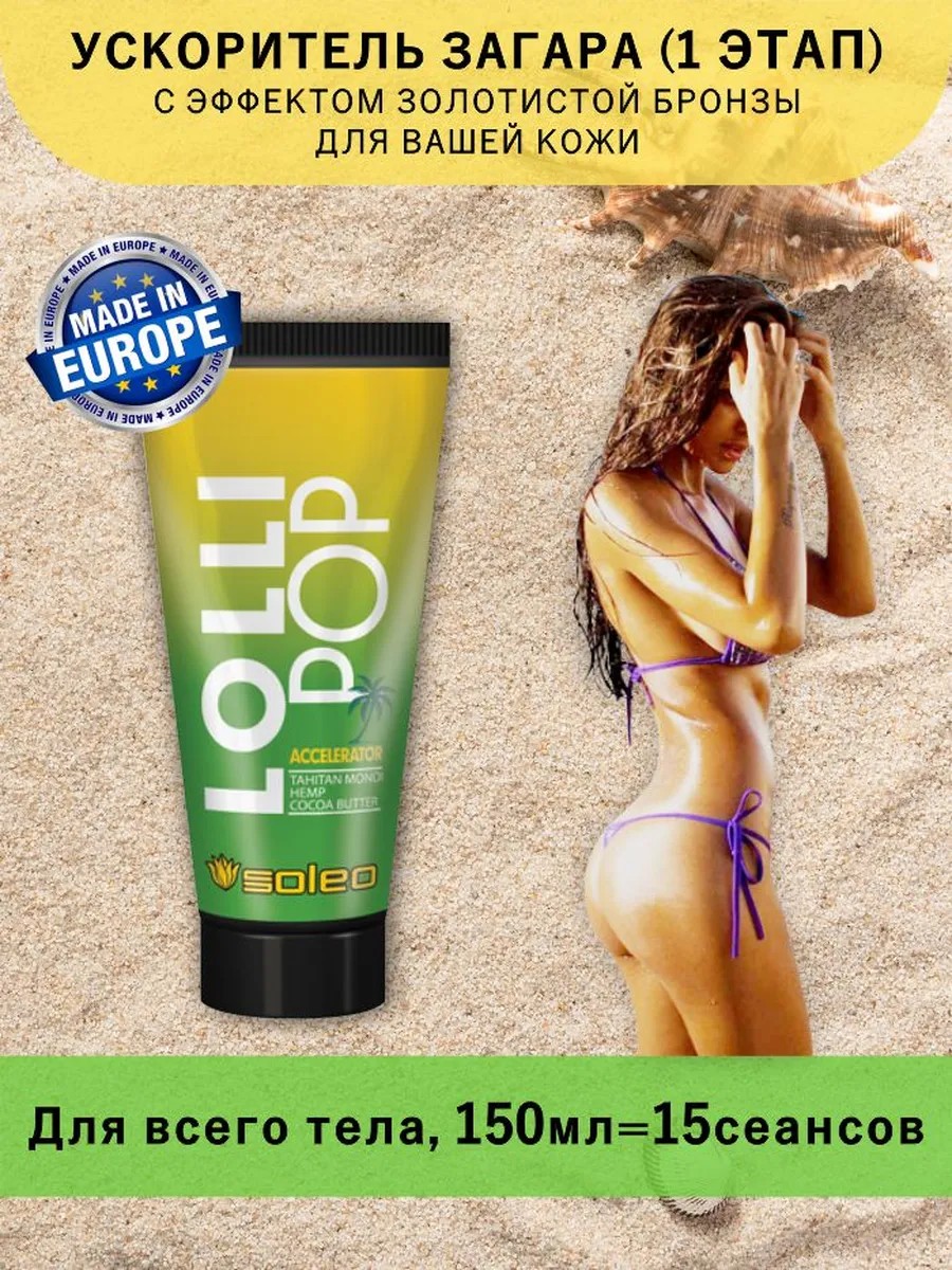 Внимание! прежде чем пользоваться кремами для загара правильно подберите подходящий Вам в зависимости от типа кожи(См. все фото).Туба по 150мл.Профессиональные крема для загара SOLEO(Польша).Ускоритель загара LOLLI POP позаботится о Вашем комфорте и ускорит появление золотистой бронзы на Вашей коже (именно так работает тирозин). Благодаря какао-масла, масла Моной она получит солидный заряд питания, регенерации и ровный загар.-СТИМУЛИРУЕТ ЕСТЕСТВЕННЫЙ И СТОЙКИЙ ЗАГАР-ЗАЩИЩАЕТ КОЖУ ОТ ОБЕЗВОЖИВАНИЯ, ПОДДЕРЖИВАЯ ОПТИМАЛЬНУЮ СТЕПЕНЬ УВЛАЖНЕНИЯ-ДЕЛЕТ КОЖУ МЯГКОЙ И ПРИЯТНОЙ НА ОЩУПЬ-ПРОТИВОДЕЙСТВУЕТ УСКОРЕННОМУ СТАРЕНИЮ КОЖИ БЛАГОДАРЯ ИНГРЕДИЕНТАМ, ОБЛАДАЮЩИМ ДЕЙСТВИЕМ ПРОТИВ СВОБОДНЫХ РАДИКАЛОВТак же можете преобрести другие расходники для посещения солярия, листайте фото в карточке товара. Просто введите номер артикула понравившегося Вам товара в поиске WB.Так же Вы можете нажать на кнопку ниже: "Перейти в магазин продавца" под м товара.Будьте прекрасны и здоровы! LOLLI_POP__150ml1