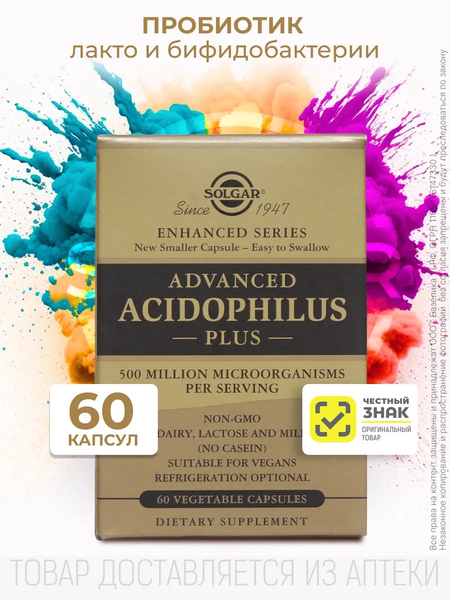 Бренд Solgar (Солгар) - всемирно известный производитель высокоэффективных натуральных препаратов для здоровья. Капсулы «Ацидофилус плюс» (Advanced Acidophilus Plus Vegetable Capsules) - сбалансированный состав. Ацидофилус плюс рекомендуется для восстановления микрофлоры кишечника. При производстве «Ацидофилус плюс» используется особая технология двойного капсулирования, которая обеспечивает выживаемость бактерий при прохождении через желудочно-кишечный тракт. «Ацидофилус плюс» можно принимать людям с непереносимостью лактозы. «Ацидофилус плюс» не требует хранения в холодильнике. Не содержит лактозы, казеина. Без консервантов. Подходит для вегетарианцев. без красителей. без отдушек. Рекомендуемый прием (1 капс.) содержит: