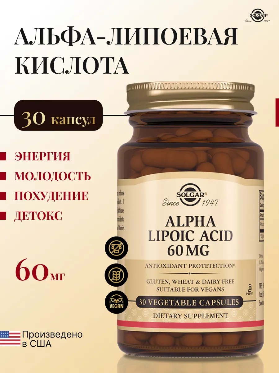 Альфа–липоевая кислота обладает антиоксидантным действием, способствует замедлению процессов старения, регуляции уровня сахара в крови, выведению солей тяжелых металлов из организма; участвует в образовании энергии, что позволяет более интенсивно заниматься спортом. Капсулы «Альфа-липоевая кислота 60 мг» производятся без добавления сахара, соли, дрожжей, глютена и других потенциальных аллергенов, что подтверждает высокое качество и профиль безопасности продукта.