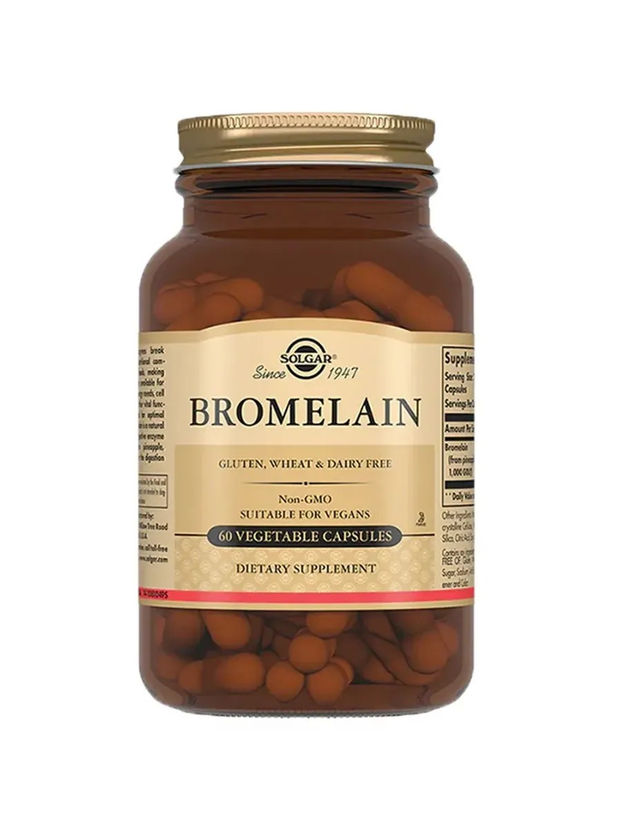 Бромелайн — это пищеварительный фермент, выделенный из ананаса. «Бромелайн» способствует пищеварению, расщеплению белковой пищи и усвоению ее организмом, а также рекомендуется в качестве дополнительного средства для уменьшения воспаления, отека и ускорения восстановления тканей при спортивных травмах, ушибах, растяжениях.