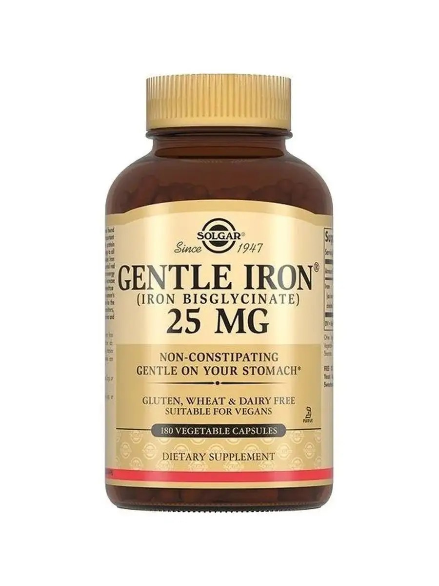 Солгар «Легкодоступное железо Джентл Айрон» содержит 25 мг железа в органической форме. Эта форма легко усваивается и снижает риск развития нежелательных эффектов со стороны желудочно-кишечного тракта.