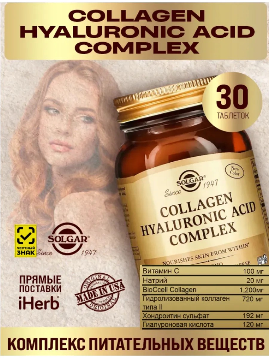 Таблетки "Комплекс коллагена и гиалуроновой кислоты" (Solgar) представляют собой продукт высокого качества, который помогает сохранить молодость, свежесть и увлажнение кожи, а также замедлить процессы старения и появления морщин, поддержать баланс необходимых микроэлементов в организме (своеобразные таблетки красоты). В составе: BioCcell Cоllagen -1200mg, Гидролизованный коллаген типа II (2 типа) 720 мг,, Хондроитин сульфат 192 мг, Гиалуроновая кислота 120 мг, Аскорбат кальция 100 мг.. Vitamin C. Этот сбалансированный состав обеспечивает отличное увлажнение и длительное смягчение кожи, а также улучшает ее тургор. Важным компонентом этого продукта является гиалуроновая кислота, которая содержится в низкомолекулярной форме, входит во многие женские кислоты. Это обеспечивает высокую степень усвоения гиалуроновой кислоты и коллагена II типа, которые также входят в состав. Коллаген капсулы II типа и хондроитинсульфат оказывают положительное влияние на состояние хрящевой ткани (хондропротекторы), что особенно важно для здоровья суставов и связок. Так же этот мультивитаминный комплекс необходим для роста (против выпадения) волос, здоровья зубов и ногтей (восстановление). Одна таблетка "Комплекса коллагена и гиалуроновой кислоты" содержит 100 мг витамина С (аскорбиновая кислота), что составляет 167% от рекомендуемой суточной нормы. Также в составе присутствует 192 мг хондроитинсульфата, что составляет 32% от адекватного уровня потребления, и 120 мг гиалуроновой кислоты, что составляет 240% от адекватного уровня потребления. Важно отметить, что все эти значения не превышают верхний допустимый уровень потребления. Таблетки "Комплекс коллагена и гиалуроновой кислоты" представляют собой премиум-продукт, который поможет вам поддерживать кожу в хорошем состоянии и замедлить процессы старения лица и тела. Их сбалансированный состав и высокая степень усвоения компонентов делают этот продукт эффективным и безопасным для использования. Подойдет как для женщин, так и для мужчин. Наш витаминный комплекс так же дополнит любое спортивное питание (спорт пит), мультивитамины для беременных и кормящих женщин. Он подходит для людей, кто придерживается здорового образа жизни (зож). Рекомендуется принимать одну таблетку в день во время еды. Длительность приема составляет 1 месяц. Однако перед началом приема этой биологически активной добавки (БАД) рекомендуется проконсультироваться с врачом, поскольку она не является лекарственным средством.