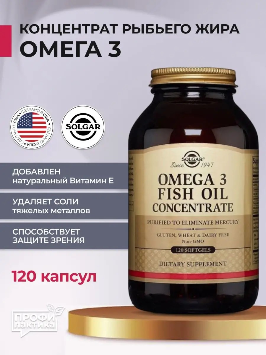 Концентрат рыбьего жира Омега-3 (Omega-3 Fish Oil Concentrate Softgels) - данная формула представляет собой натуральный концентрированный рыбий жир с оптимальным содержанием омега-3 полиненасыщенных жирных кислот, которые способствуют защите зрения, улучшению работы головного мозга, профилактике сердечно-сосудистых заболеваний, снижению уровня холестерина, способствуют хорошему настроению.